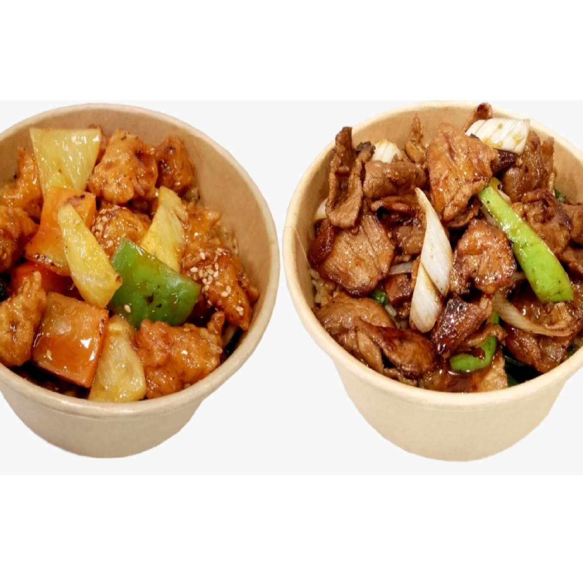 Dos bowls, con Base de Chow Fan o Fideo + Dos Especialidades