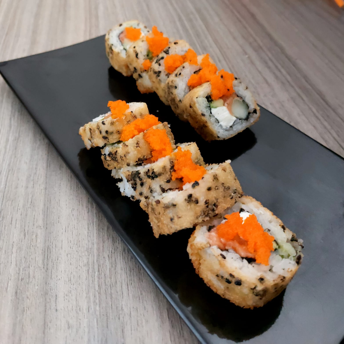 Por dentro: Alga, queso crema, pepino, aguacate y salmón. Por fuera: arroz, empanizado, masago y ajonjolí negro (10pzas)