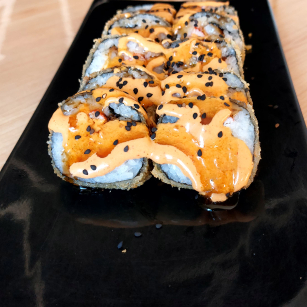 Por fuera: Arroz, empanizado y bañado con aderezo de chipotle. Por dentro: Aguacate, alga, queso crema, camarón empanizado y filete.