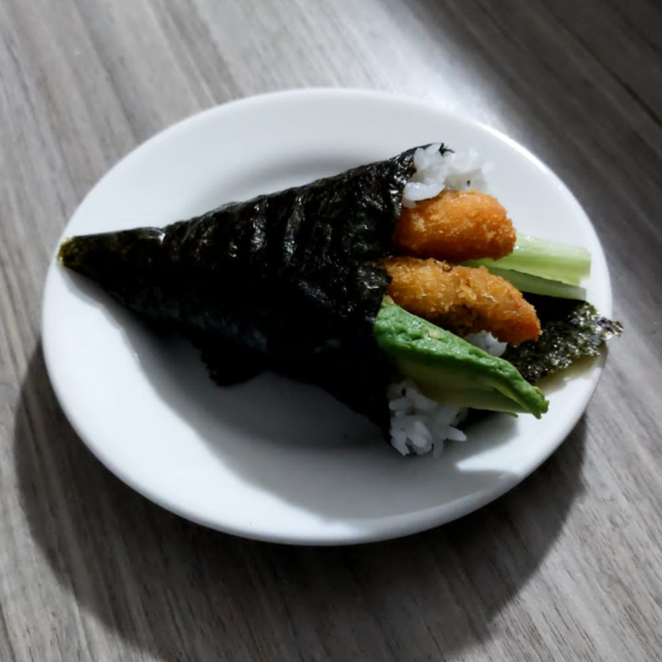 Alga, arroz, aguacate, pepino y cangrejo empanizado