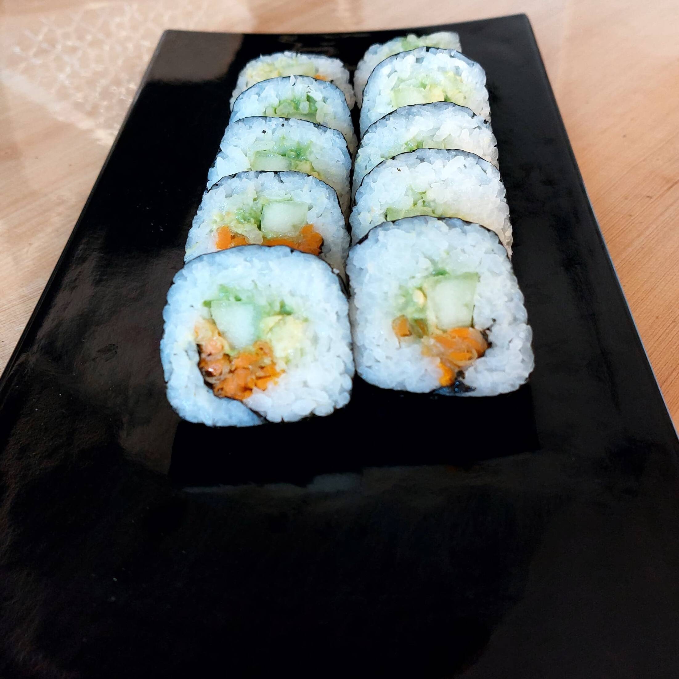 Por dentro: Arroz, pepino, aguacate, zanahoria crocante y queso crema. Por fuera: Alga. (10pzas)