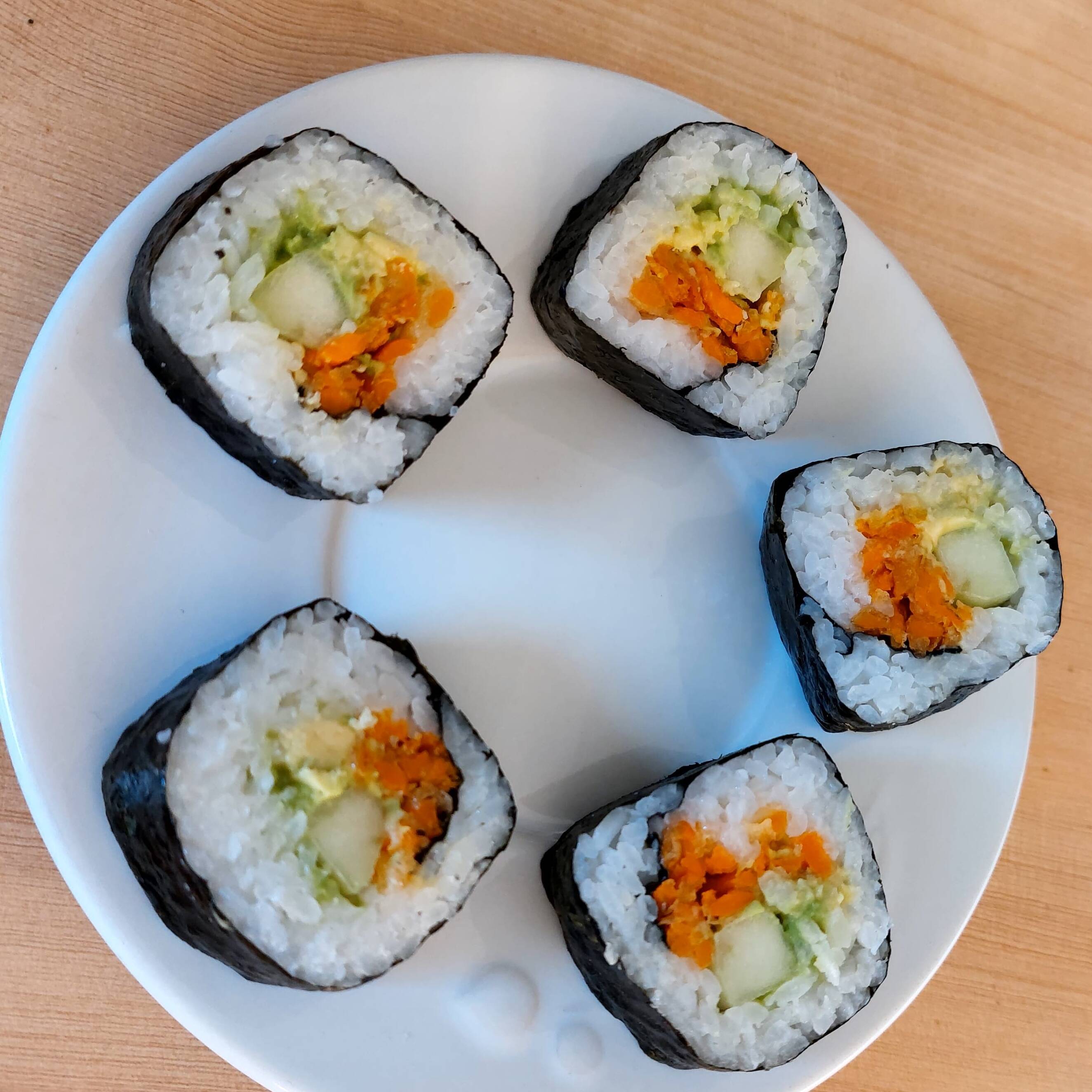 Por dentro: Arroz, pepino, zanahoria crocante y aguacate. Por fuera: Alga.(5pzs)