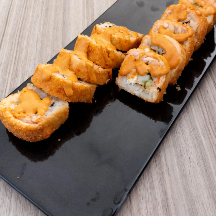 Por fuera: Arroz, empanizado y bañado con aderezo de chipotle. Por dentro: Aguacate, alga, queso crema, camarón empanizado y filete. (5 pzas)