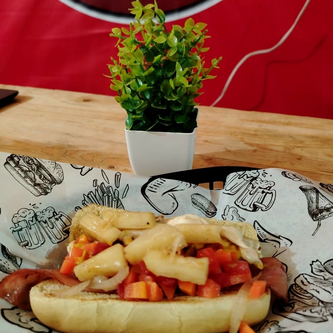 Salchicha, piña, queso Oaxaca, zanahoria, jitomate, cebolla, cátsup, mayonesa y mostaza.