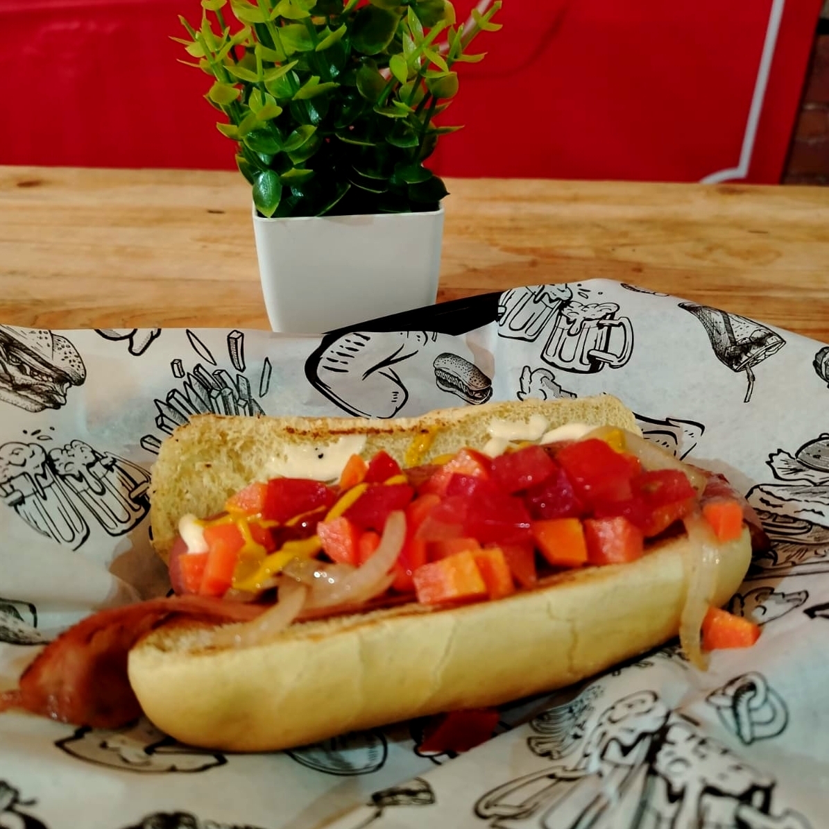 Salchicha, tocino, zanahoria, jitomate, cebolla, cátsup, mayonesa y mostaza.