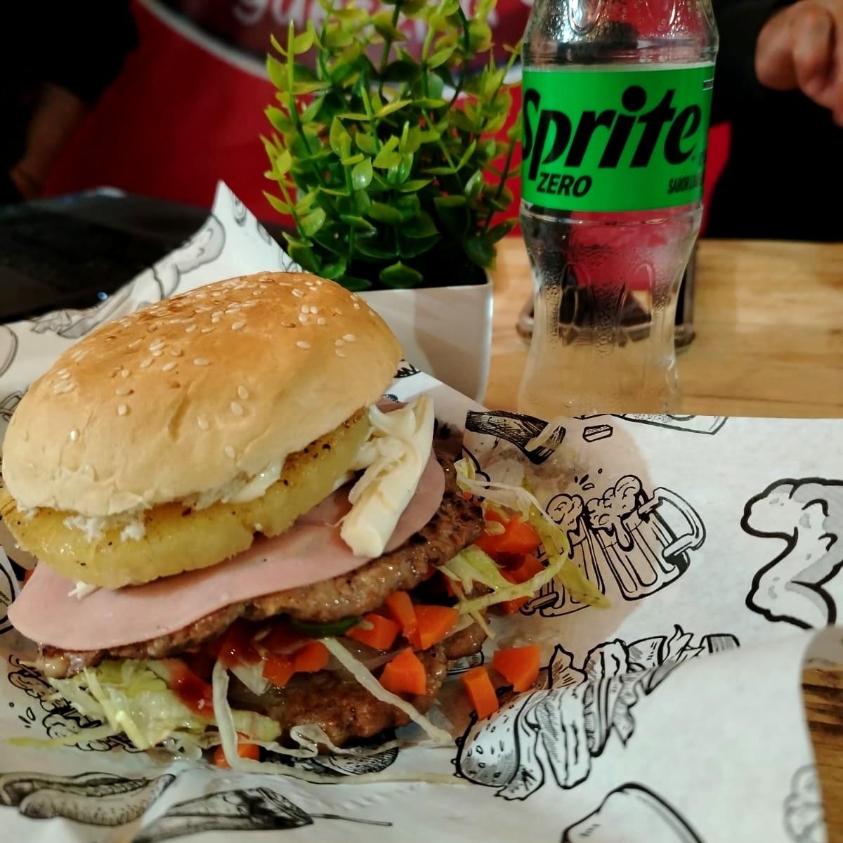 Doble carne de res, piña, queso Oaxaca, cebolla, zanahoria, jitomate, lechuga, cátsup, mayonesa y mostaza.