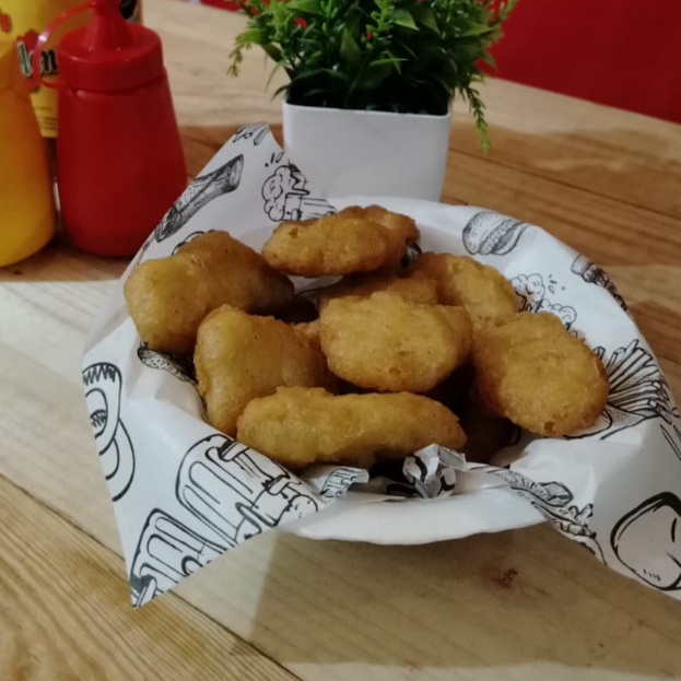 Nuggets crujientes acompañados de Valentina, cátsup, queso amarillo o salsa macha, para elegir tu combinación favorita
