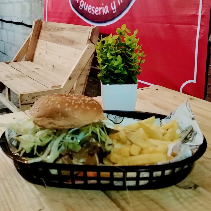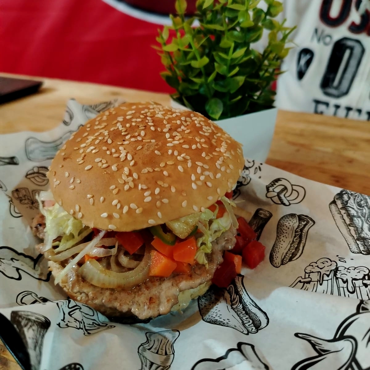 Doble carne de res, queso americano, cebolla, zanahoria, jitomate, lechuga, cátsup, mayonesa y mostaza.
