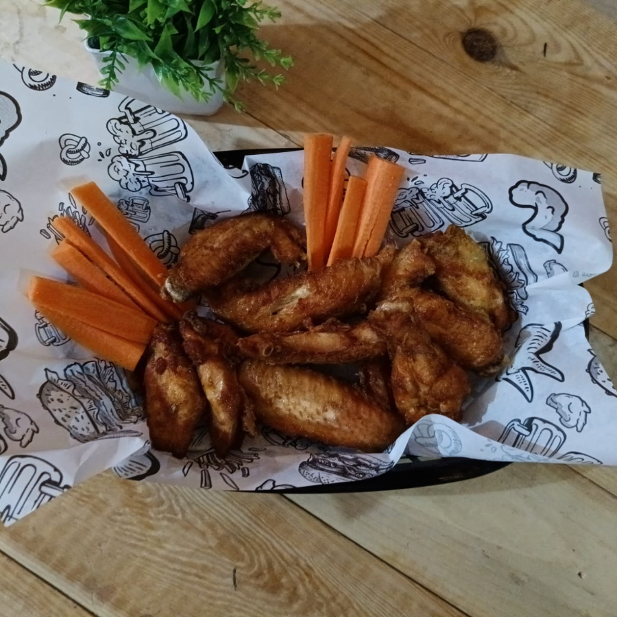 7 alitas fritas crujientes bañadas en BBQ o salsa picante, acompañadas de ranch cremoso