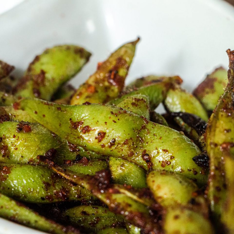 Vainas de semilla de soya tiernas, sazonadas ideales para picar entre comidas