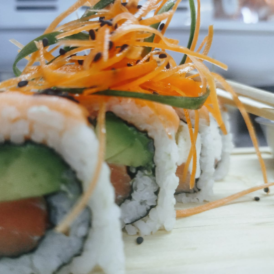 Camaron, pepino, cebolletas, aguacate, queso crema y ajonjoli por fuera