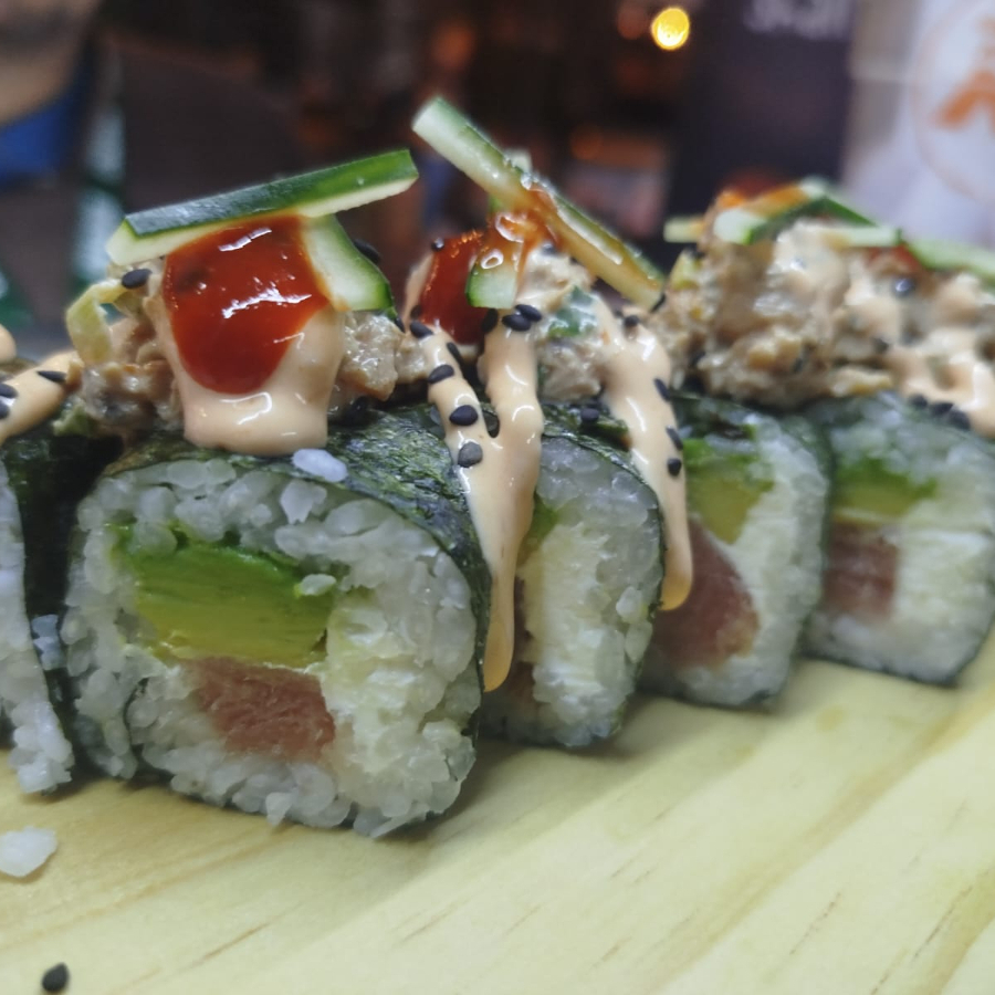 Camaron tempura, pepino, queso crema, aguacate por fuera