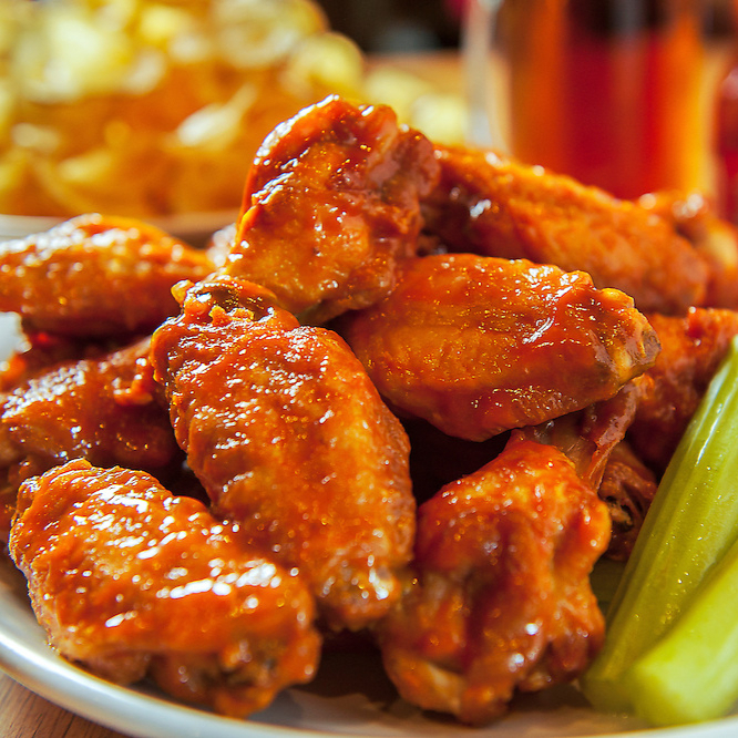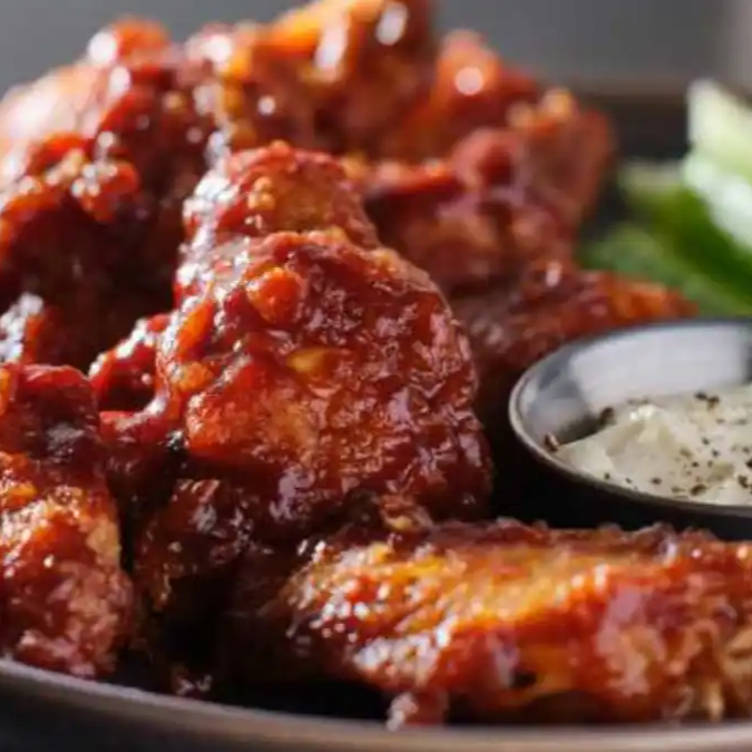 Deliciosas alitas de pollo (30)(2 kg) bañadas en tu salsas favoritas y acompañadas de un ríquisimo Ranch de la casa y de complementos como zanahoria y pepino.