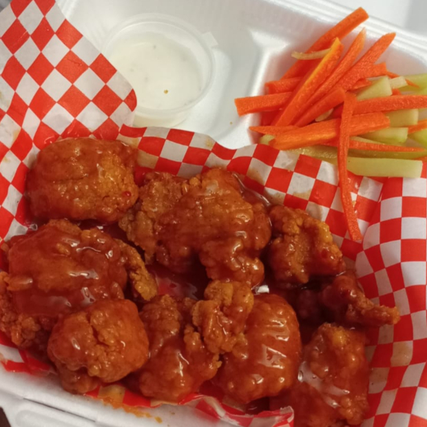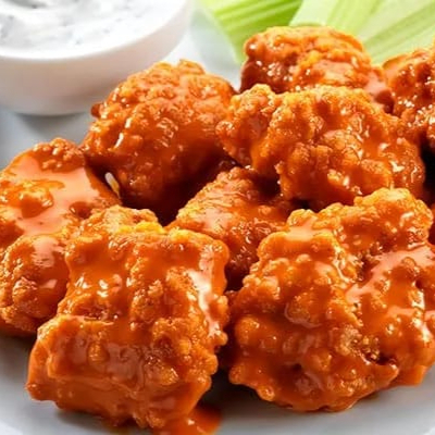 Deliciosos trozos de pollo de 450 grs bañadas en tu salsas favoritas y acompañadas de un ríquisimo Ranch de la casa y de complementos como zanahoria y pepino.