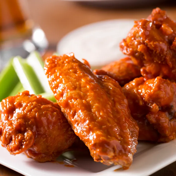 Deliciosas alitas de pollo 12 pzs bañadas en tu salsas favoritas y acompañadas de un ríquisimo Ranch de la casa y de complementos como zanahoria y pepino.