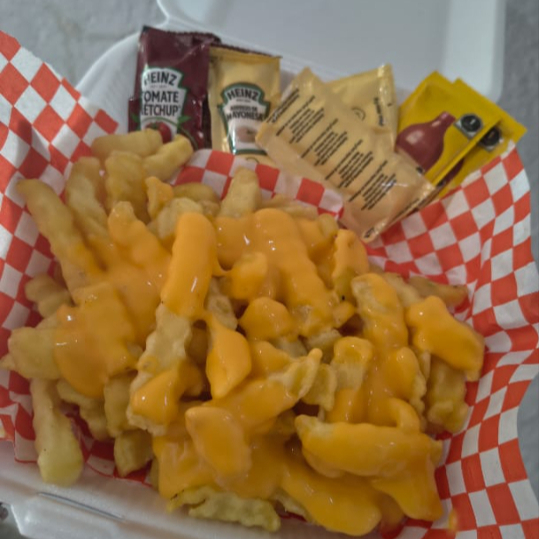 Deliciosas papas a la francesa con queso derretido , para dos personas y complementos individuales como mayonesa, ketchup y salsa valentina.