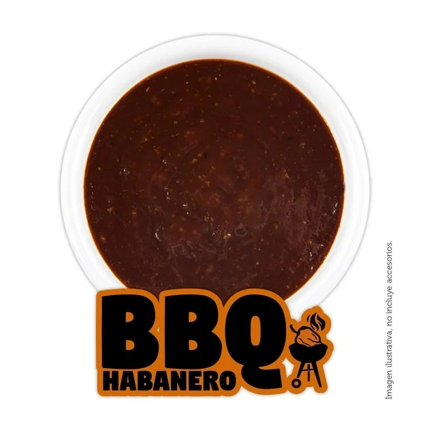 Deliciosa salsa bbq habanero en vaso de 30 ml con un sabor dulce y picante perfecta para acompañar alitas, boneless y carnes. ¡Incluso en lo que mas se te antoje!