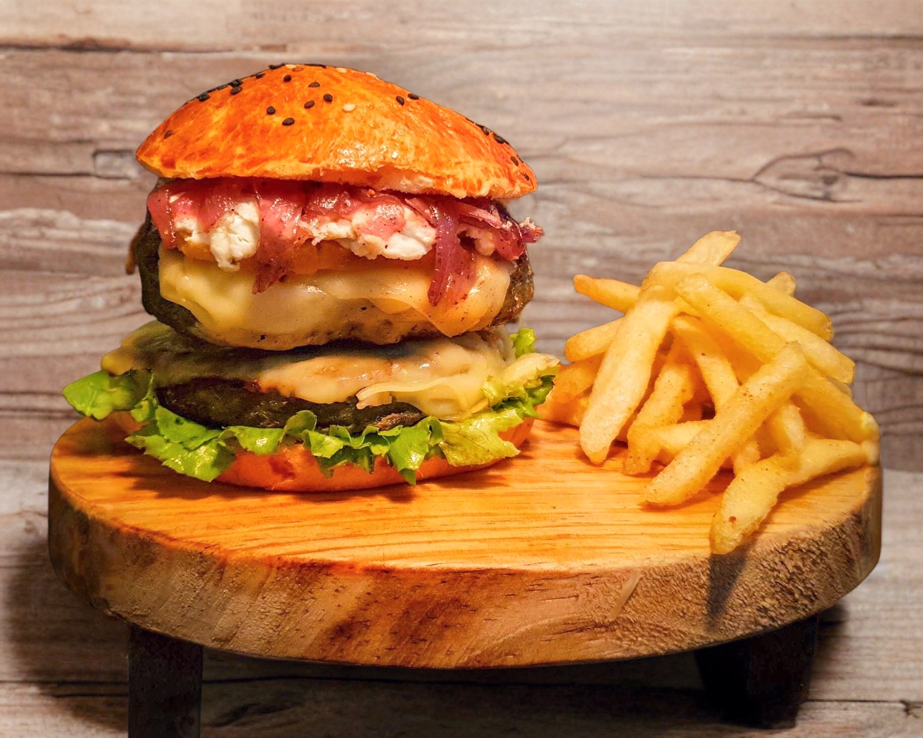 Deliciosa hamburguesa, elaborada con pan artesanal, mayonesa, lechuga romana, nuestra deliciosa, DOBLE carne con la receta de la casa, exquisito queso mozzarella y especialidad a elegir, ademas de una porcion de papas.