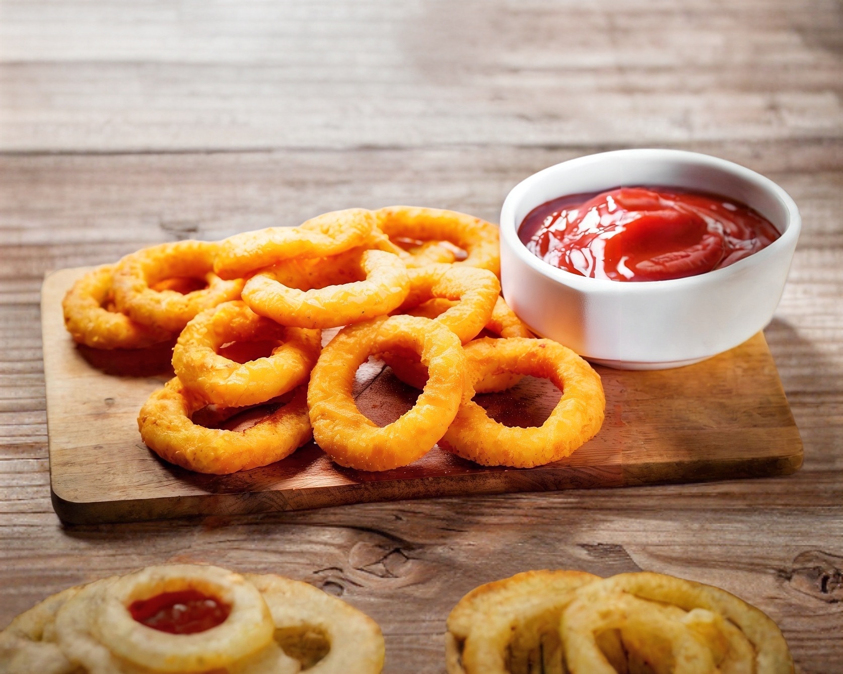 Crujientes y deliciosos aros de cebolla, acompañalos con aderezo ranch y queso.
