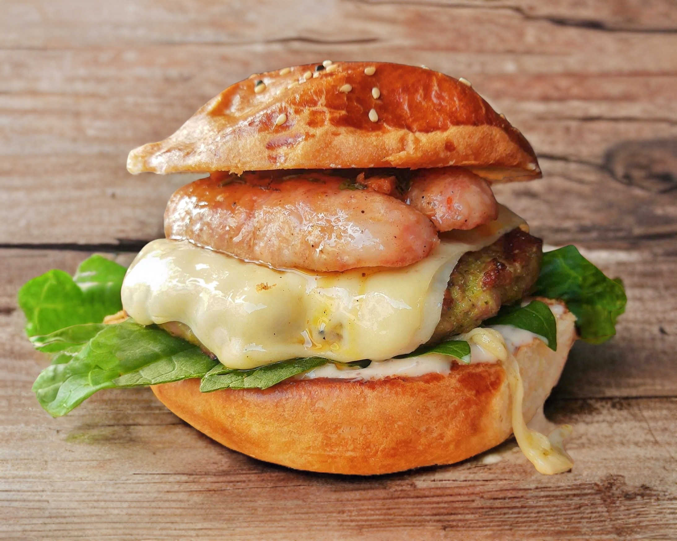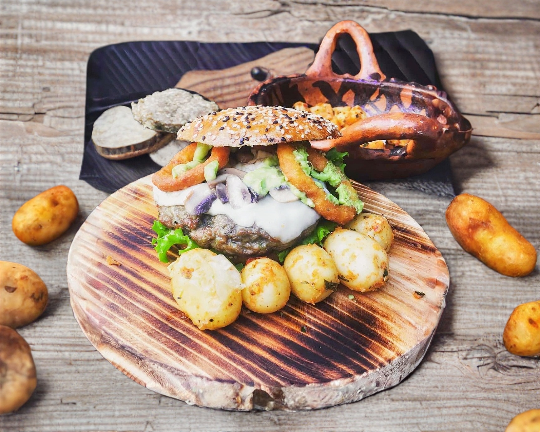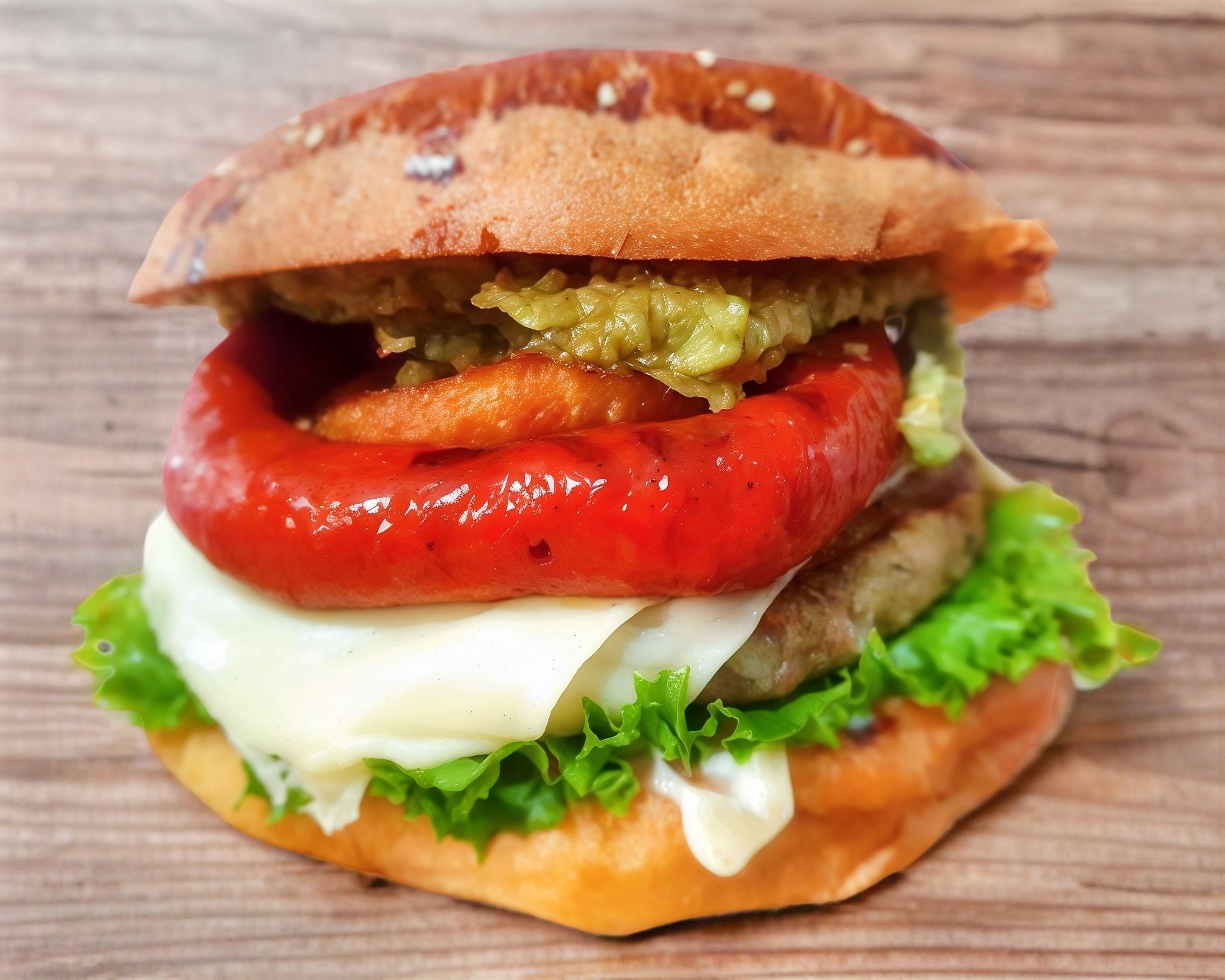 Deliciosa hamburguesa, elaborada con pan artesanal, aderezo de la casa, lechuga romana, jugosa carne con la receta de la casa, exquisito queso mozzarella, deliciosa y jugosa chistorra, crujientes aros de cebolla, guacamole y nuestro delicioso chimichurri.