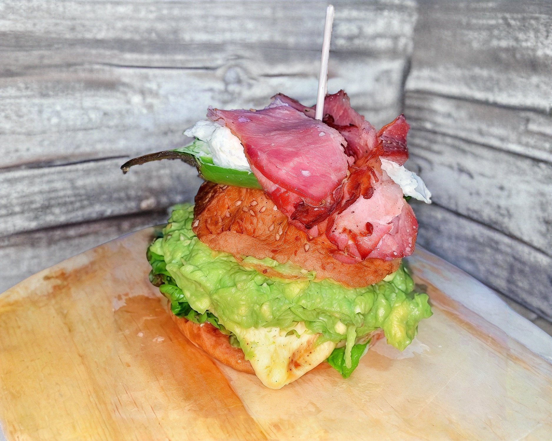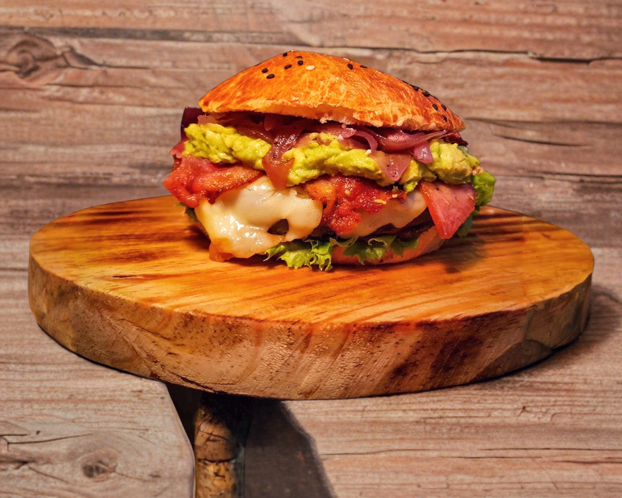 Deliciosa hamburguesa, elaborada con pan artesanal, aderezo de la casa, lechuga romana o espinca, jugosa carne con la receta de la casa, exquisito queso mozzarella, delicioso tocino y guacamole.