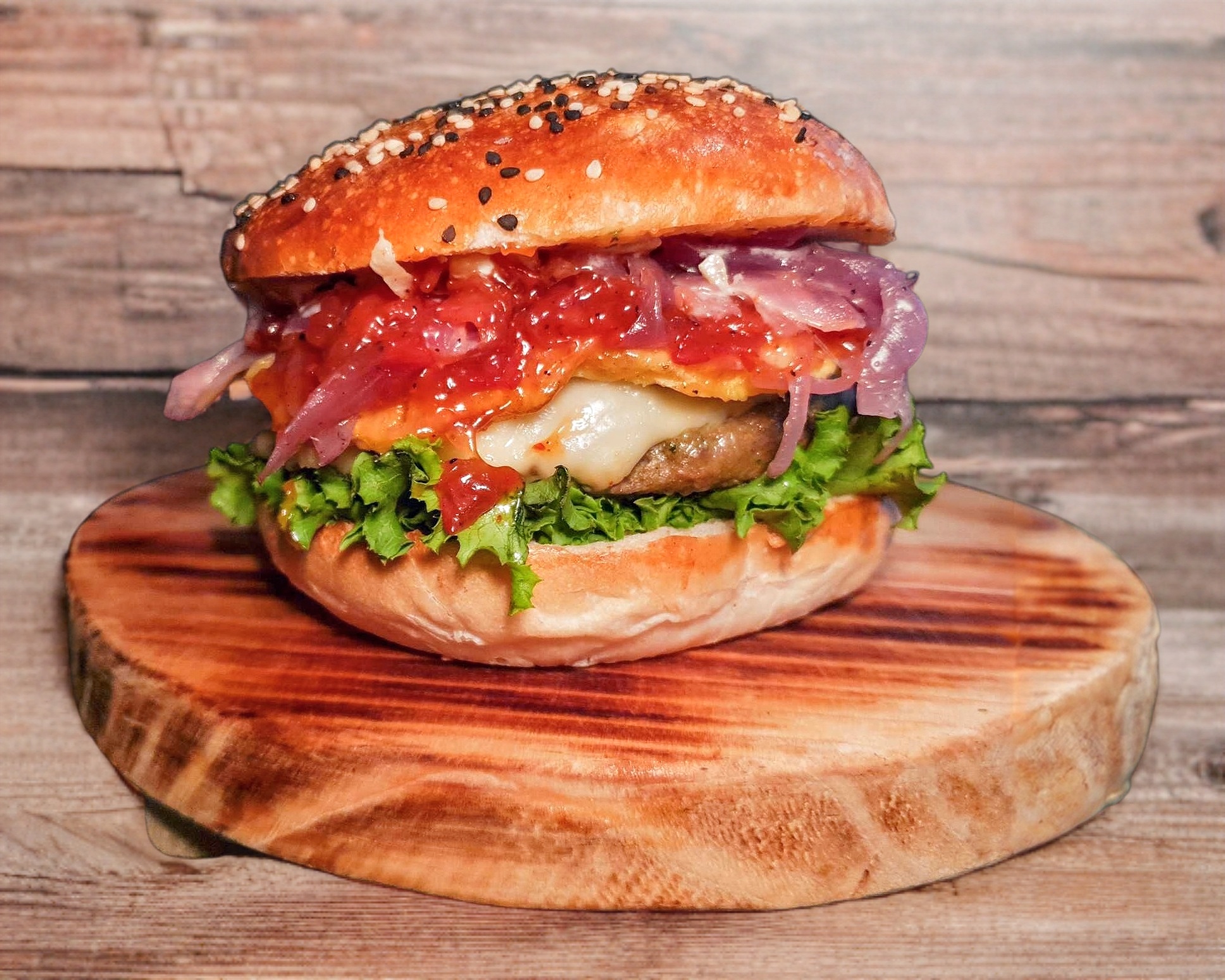 Deliciosa hamburguesa, elaborada con pan artesanal, aderezo de la casa, lechuga romana, jugosa carne con la receta de la casa, exquisito queso mozzarella, nuestra deliciosa mermelada de cereza y nuestro delicioso queso de cabra, una explosion de sabores.