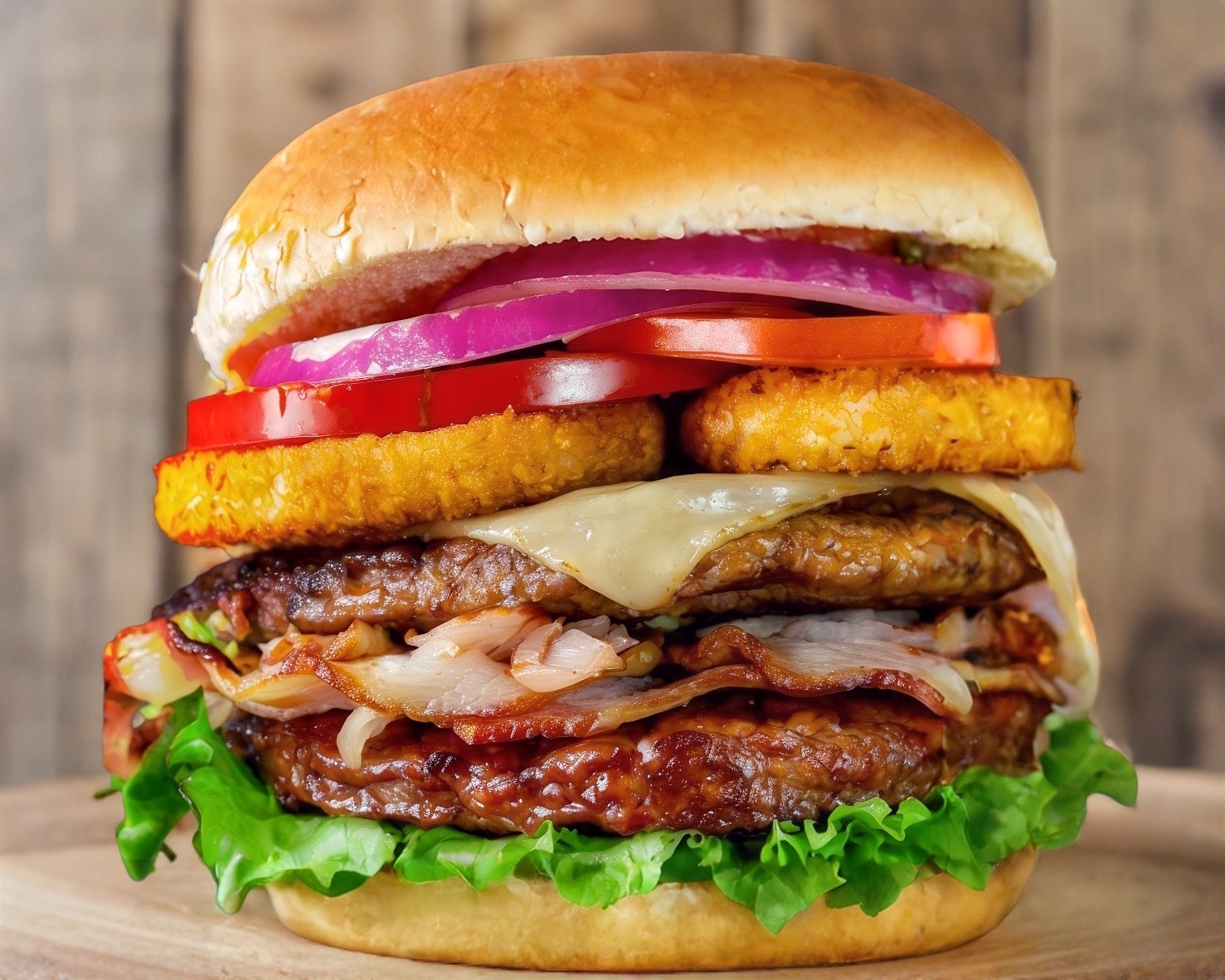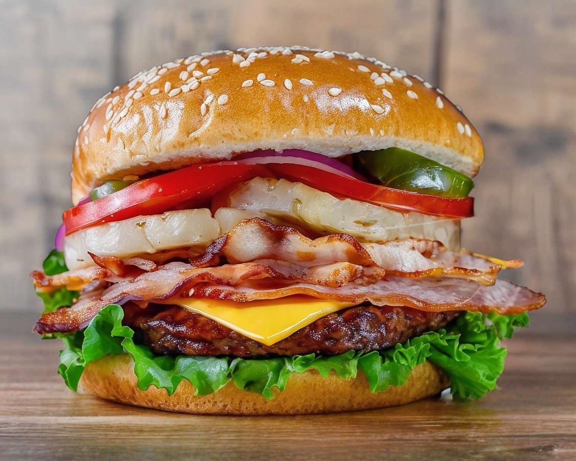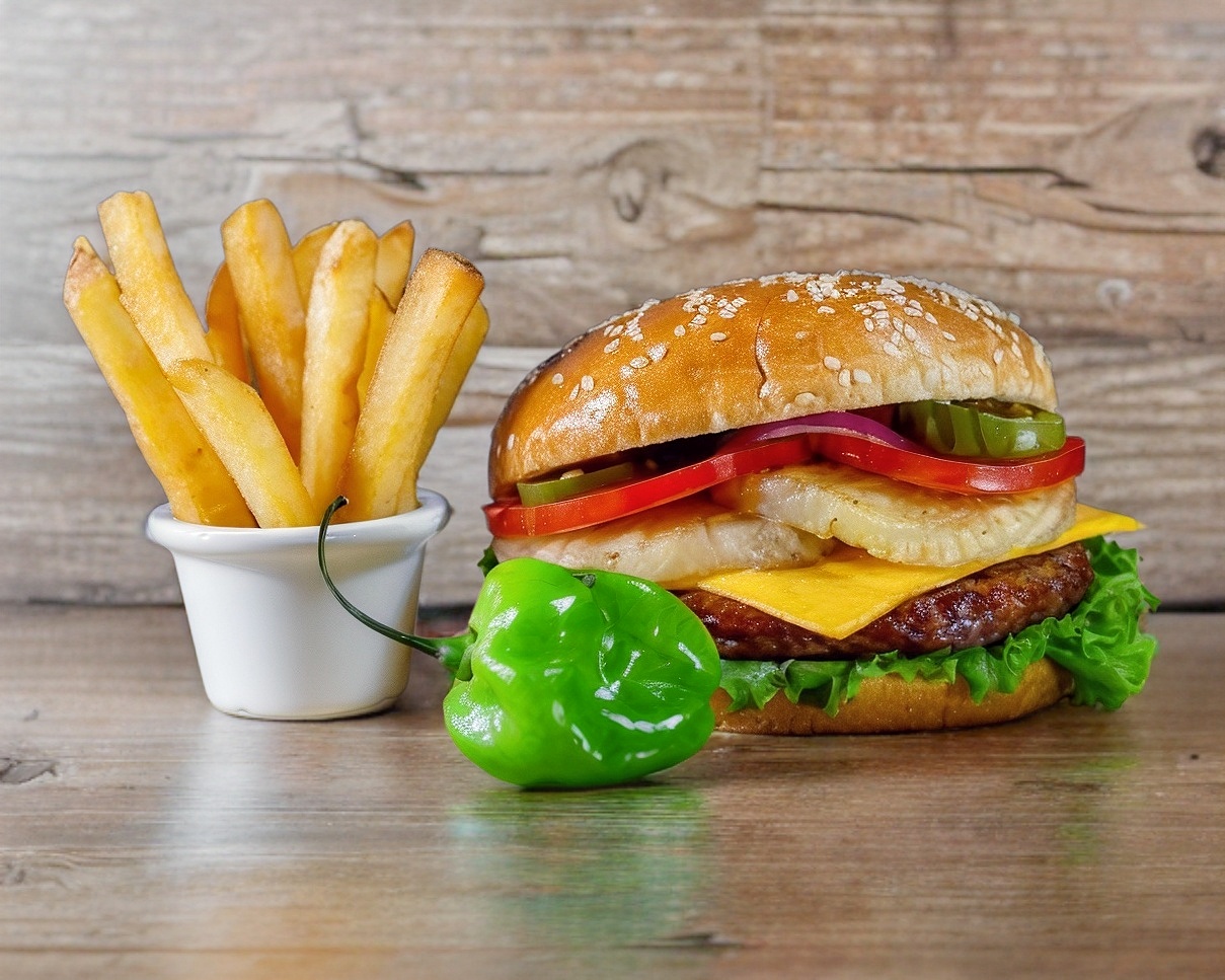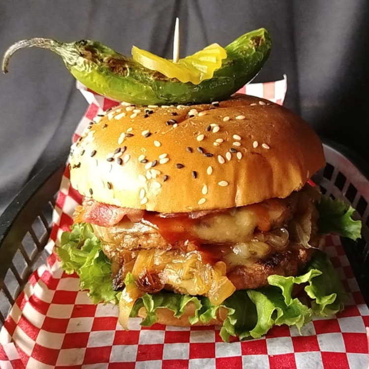 Doble carne, doble queso, cebolla dulce, aderezo bbq, chille toreado, tocino lechuga y jitomate .