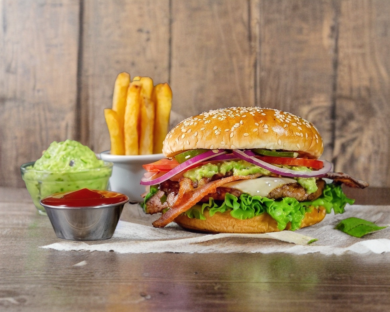 130 g de carne de res asada a la parrilla, manchego, tocino, guacamole e ingredientes tradicionales.