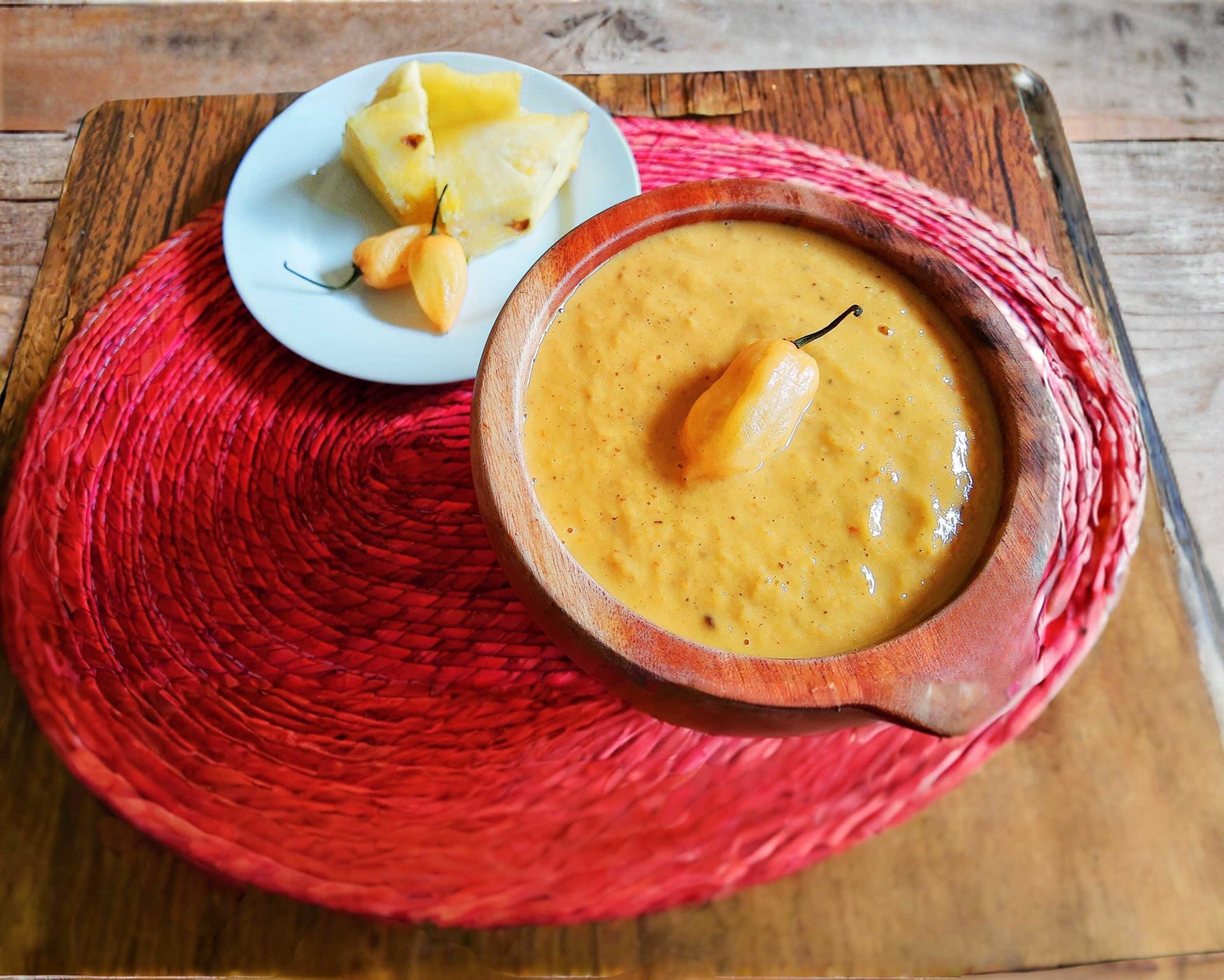Salchicha de pavo, queso, piña e ingredientes tradicionales.