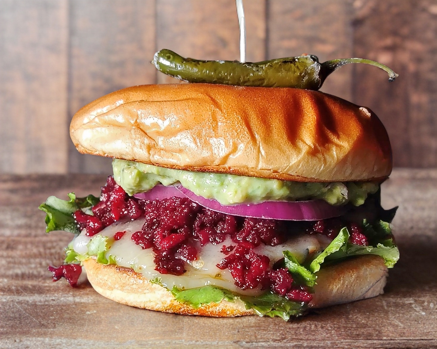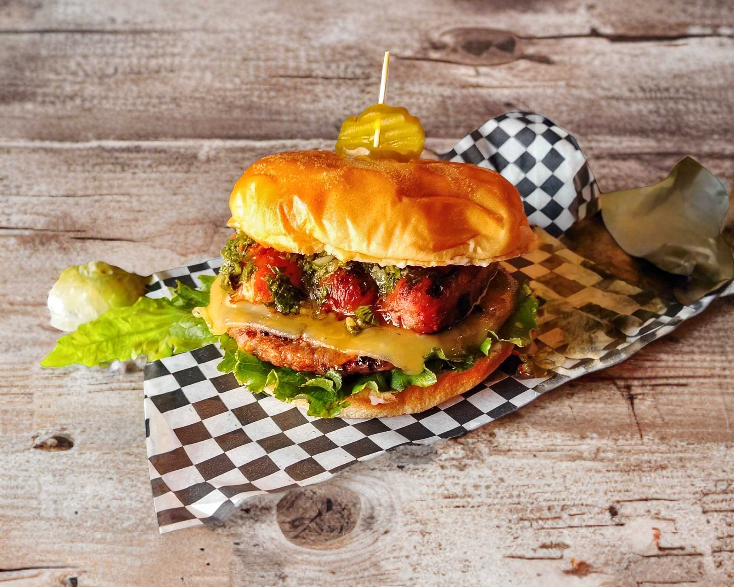 Nuestra carne, Chorizo Argentino, Chimichurri, queso monterrey jack, chile toreado y pan brioche.