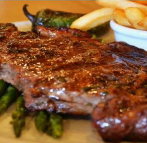 Jugoso corte de 300 gramos al grill marinado en casa, acompañada de espárragos y espaguetti al aglio e olio.