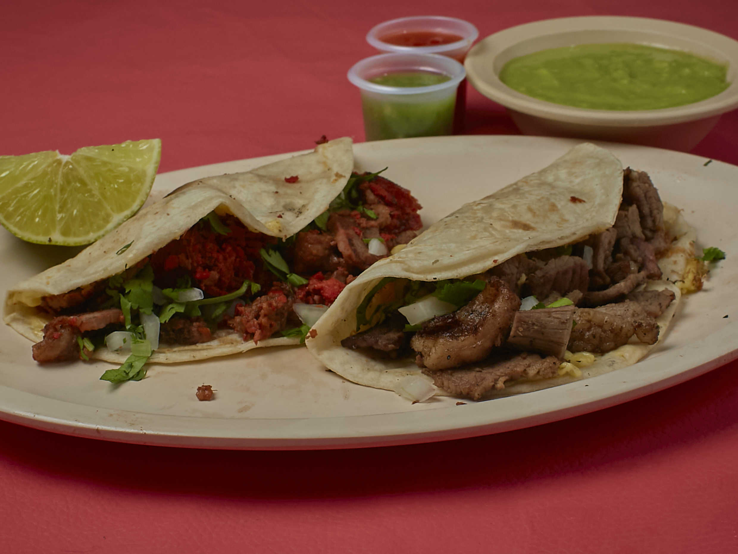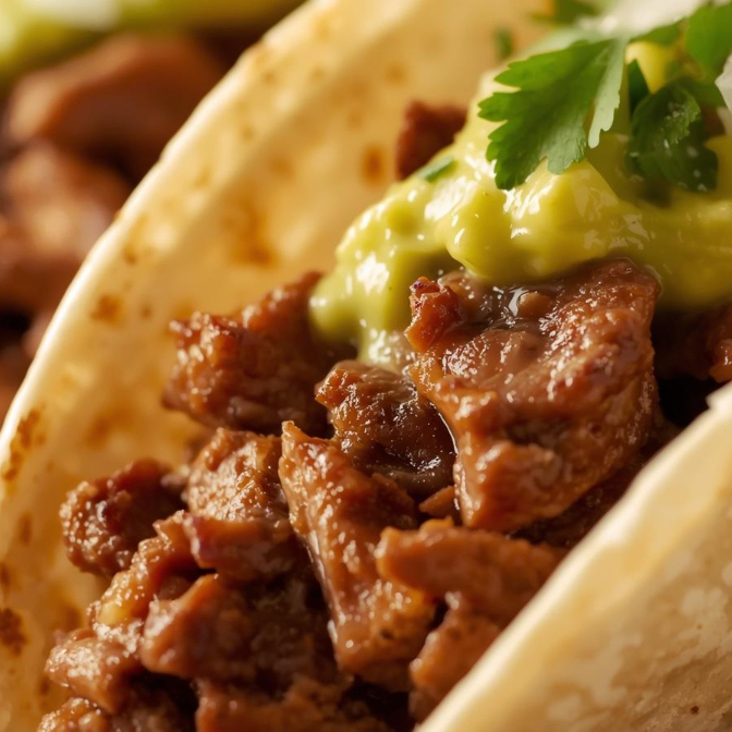 Taco de harina con carne de tu elección. Verdura y guacamole por separado.