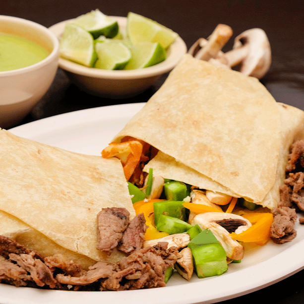 Mutila 2 tortillas de harina, carne ,champiñón, chile morrón, nopal asado, quesillo derretido, cebolla, cilantro y guacamole aparte