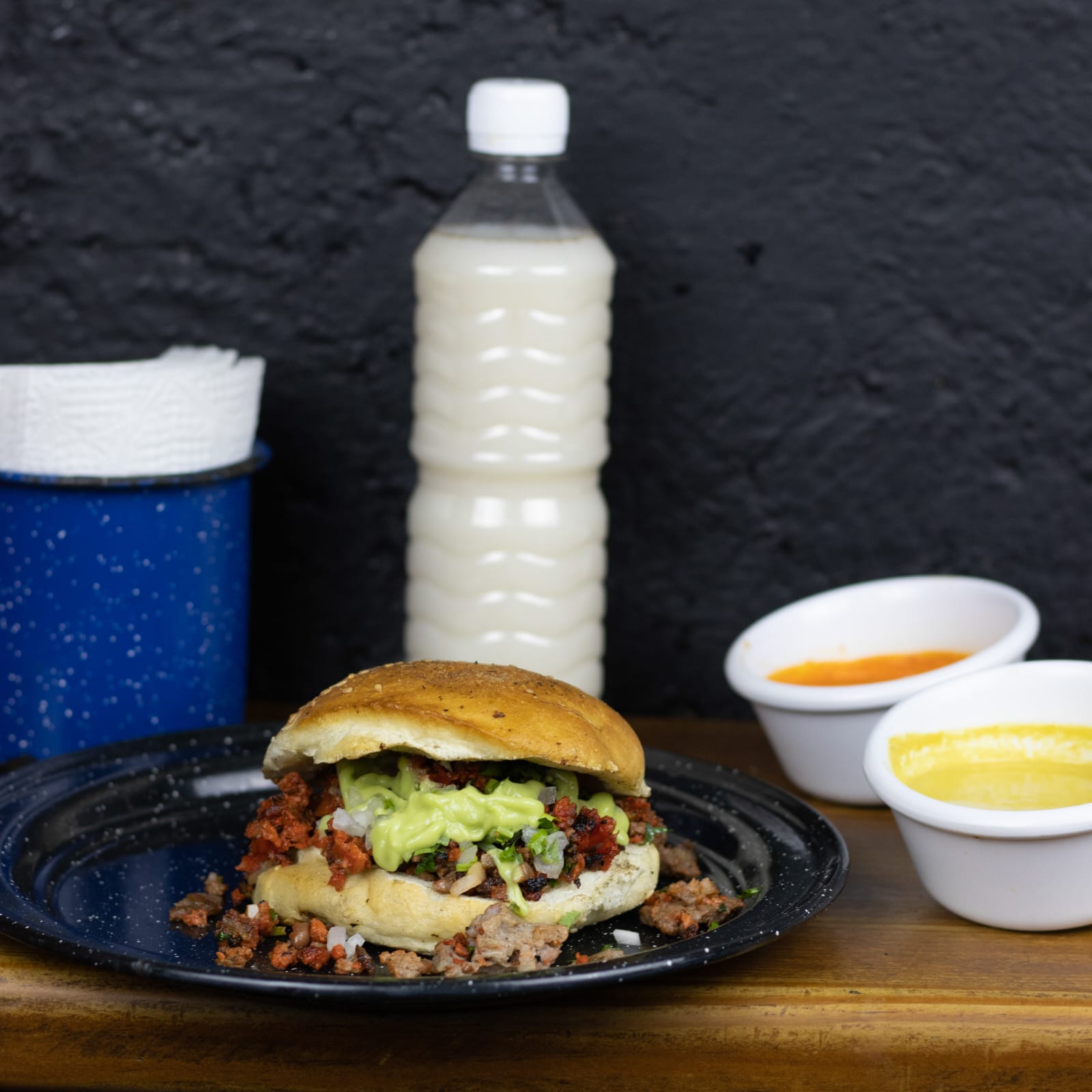 1 kilogramo de tu elección, acompañado de medio kilogramo de tortilla de maíz, 4 panes de cemitas, cebolla, cilantro, aguacate, pepinos y nuestras 4 salsas.