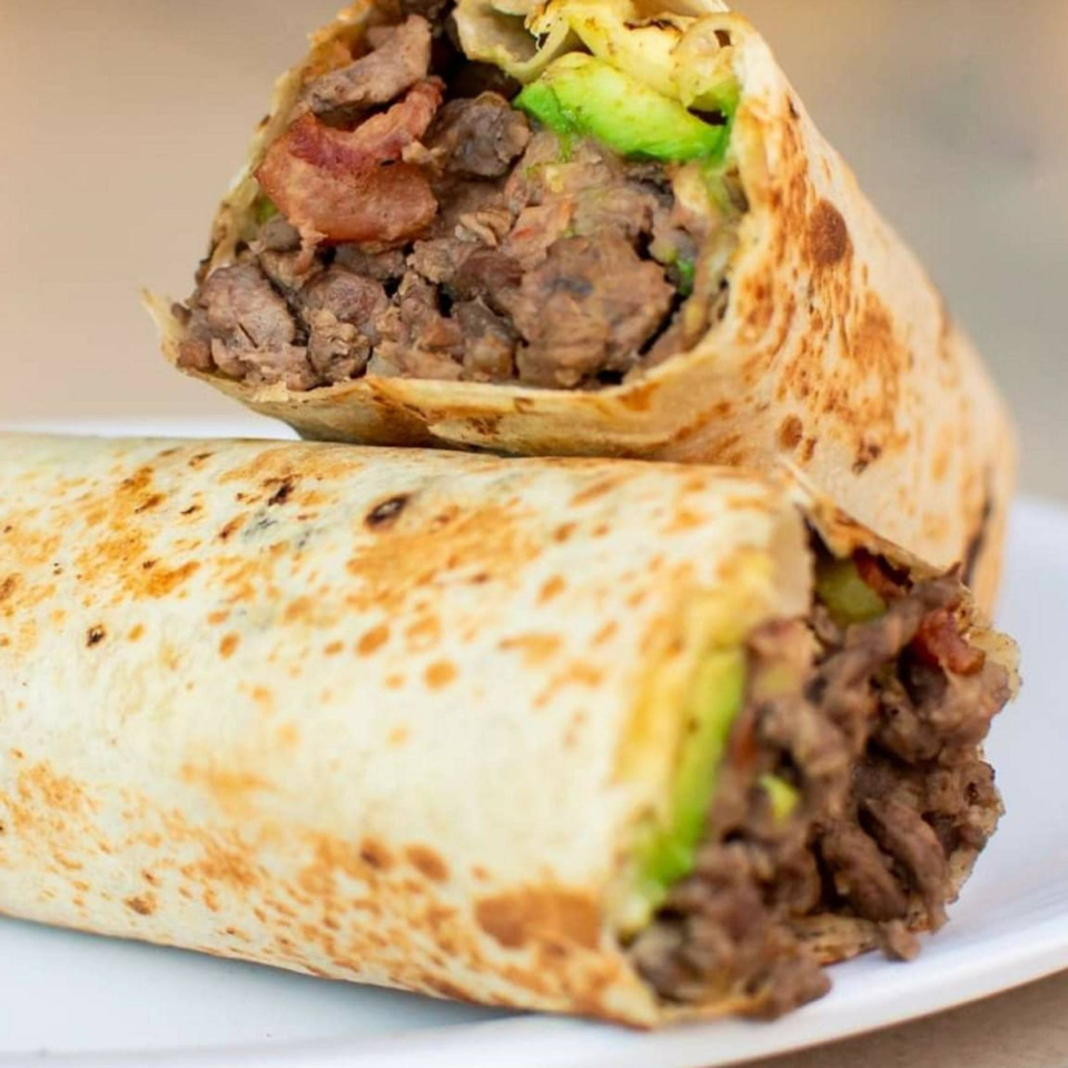 tortilla de harina acompañado con carne asada, queso oaxaca lechuga y guacamole