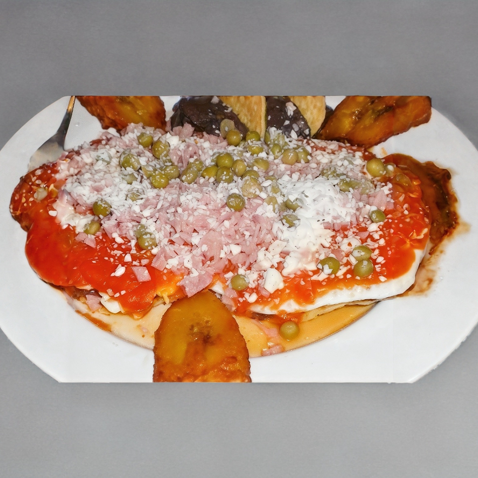 Servidos sobre tortilla refrita y jamón, bañados en salsa suiza con plátanos fritos y chicharos.