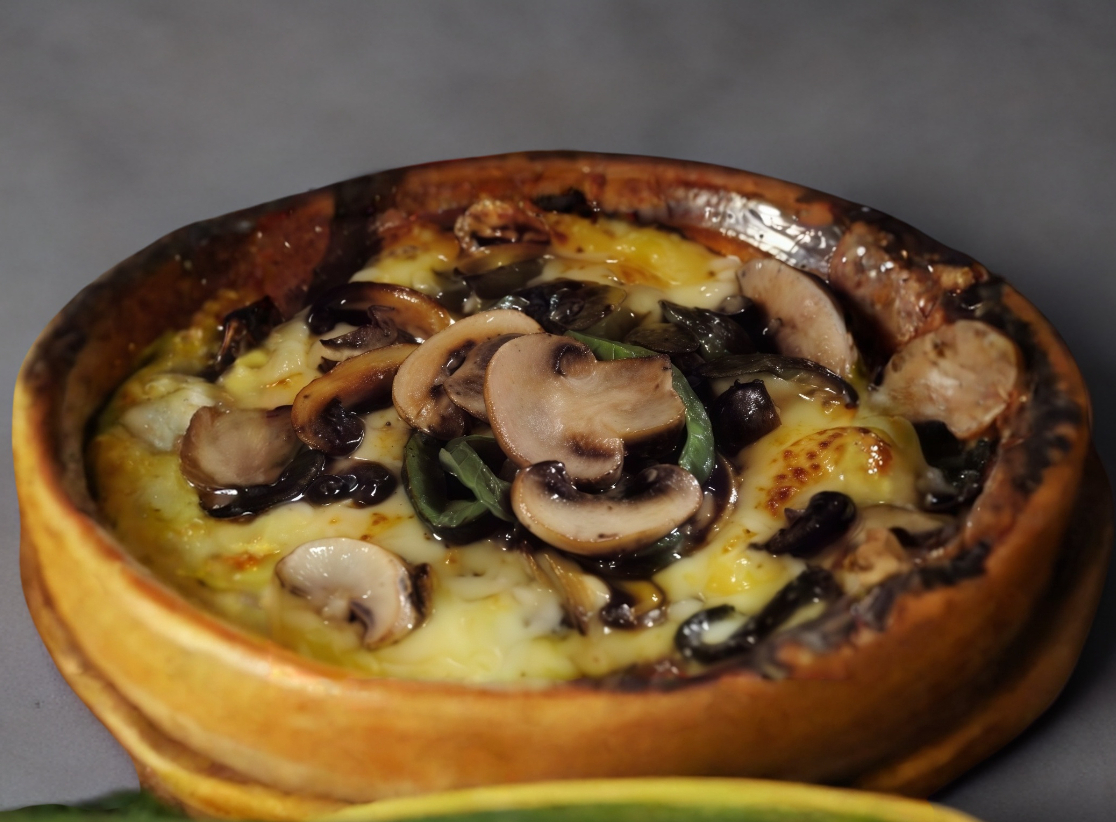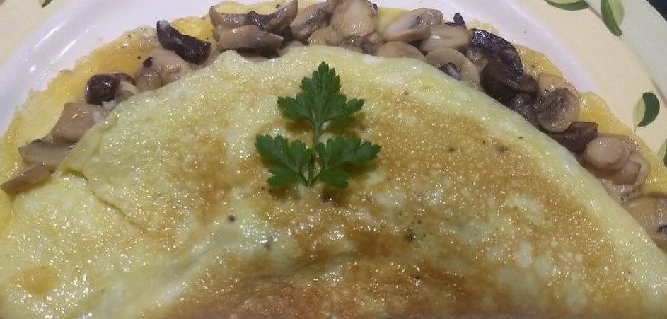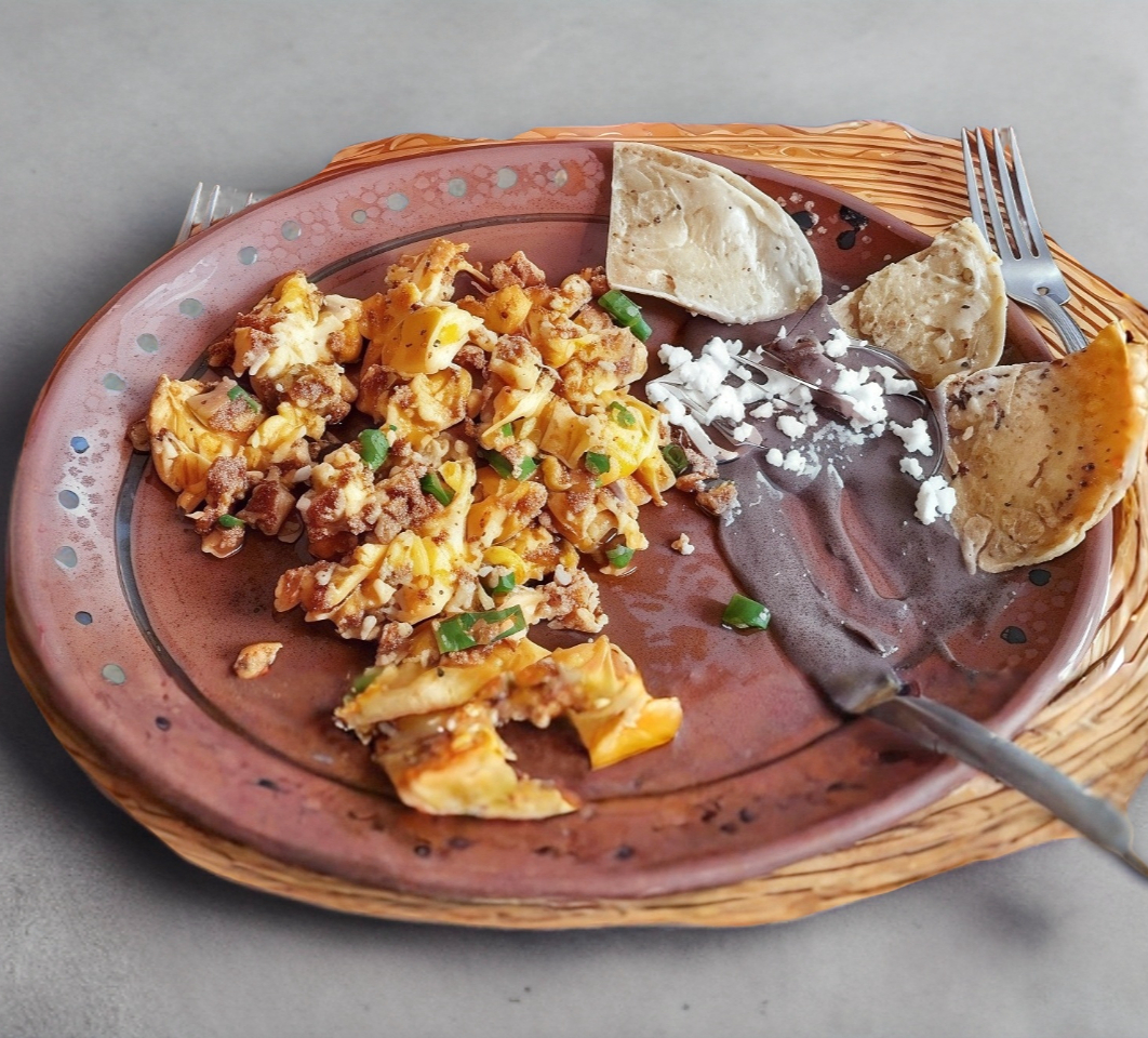 Con champiñones, espinacas y queso gouda, acompañado de frijoles refritos, salsa de la casa y tortillas de maiz.