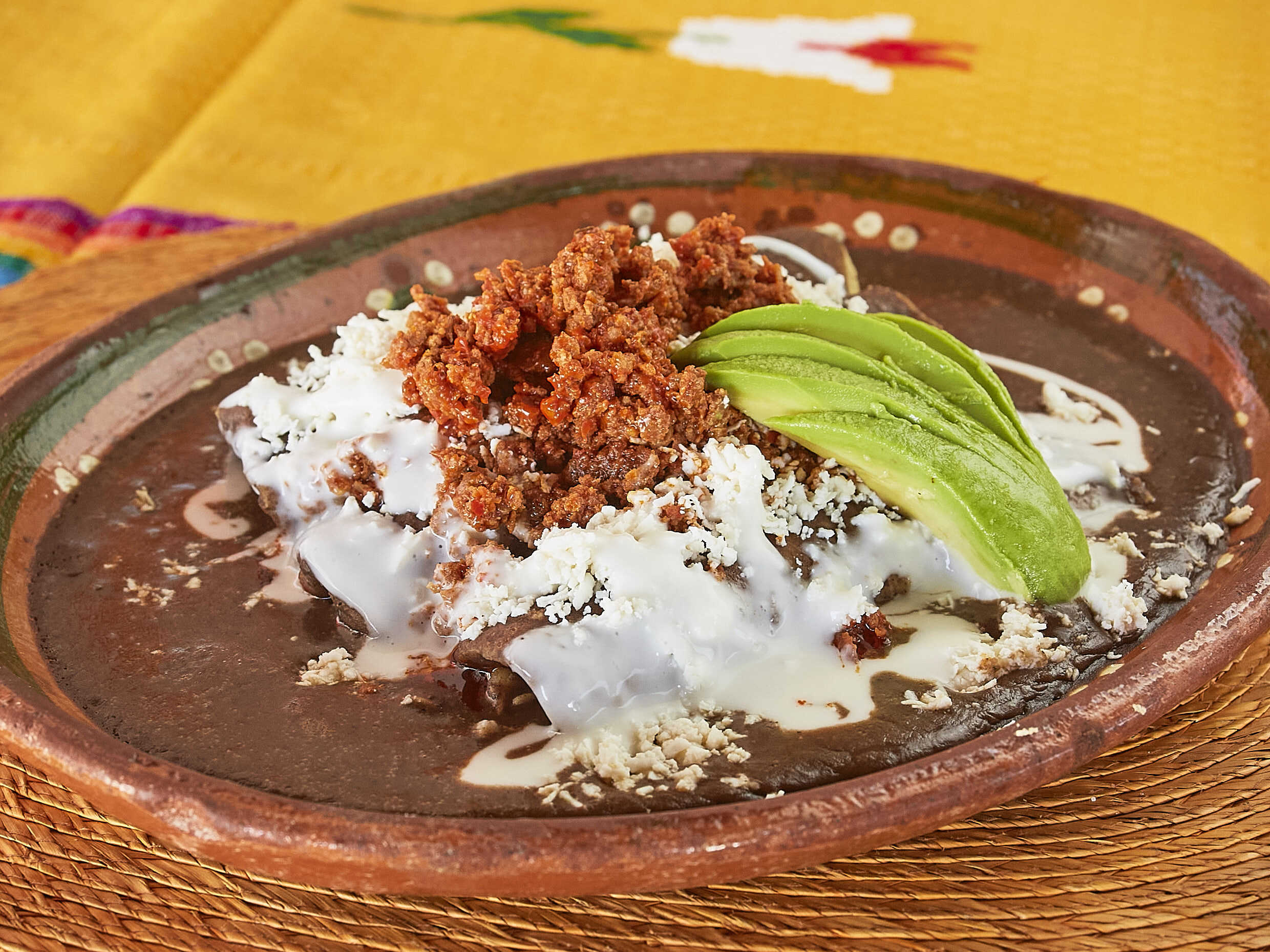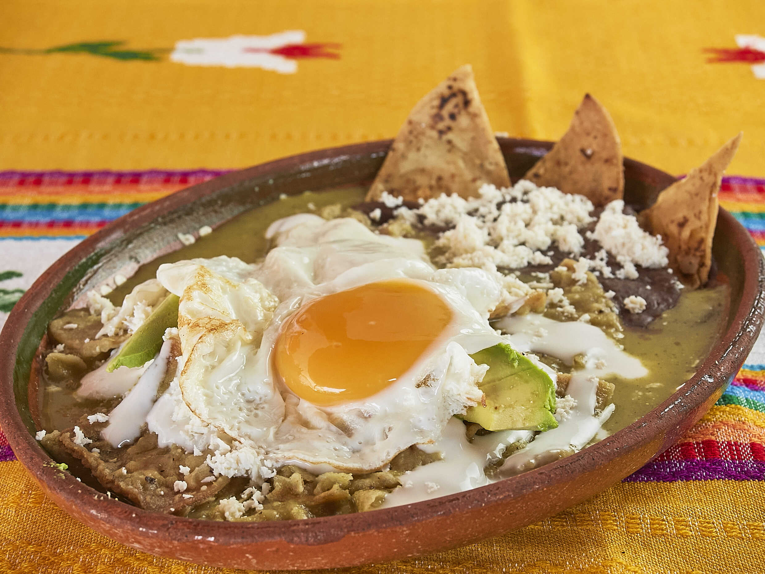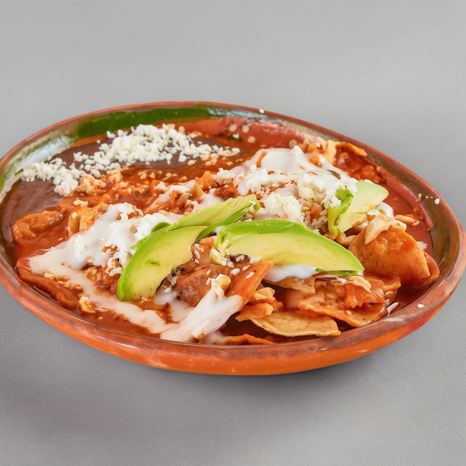 Tortilla frita en salsa de la casa sazonada con epazote y servido con aguacate y queso panela.