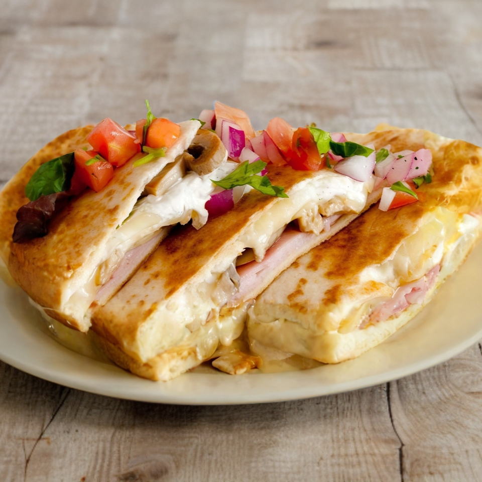 3 piezas rellenas de pechuga de pollo deshebrado y bañadas en las salsas de la casa.