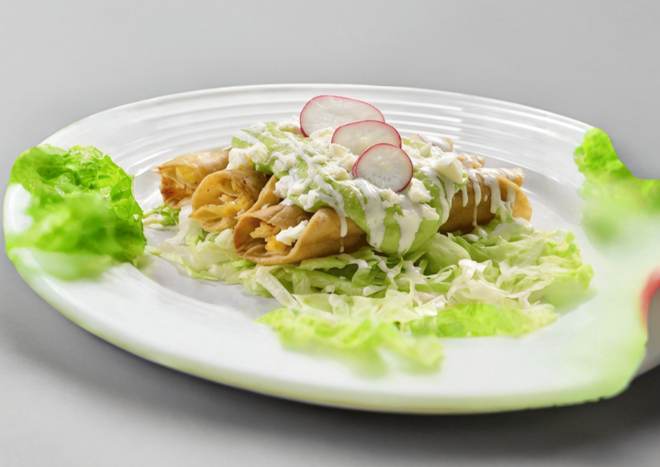 Crujientes por fuera y rellenos de pollo, servidos en una cama de lechuga fresca y coronados con queso y crema.