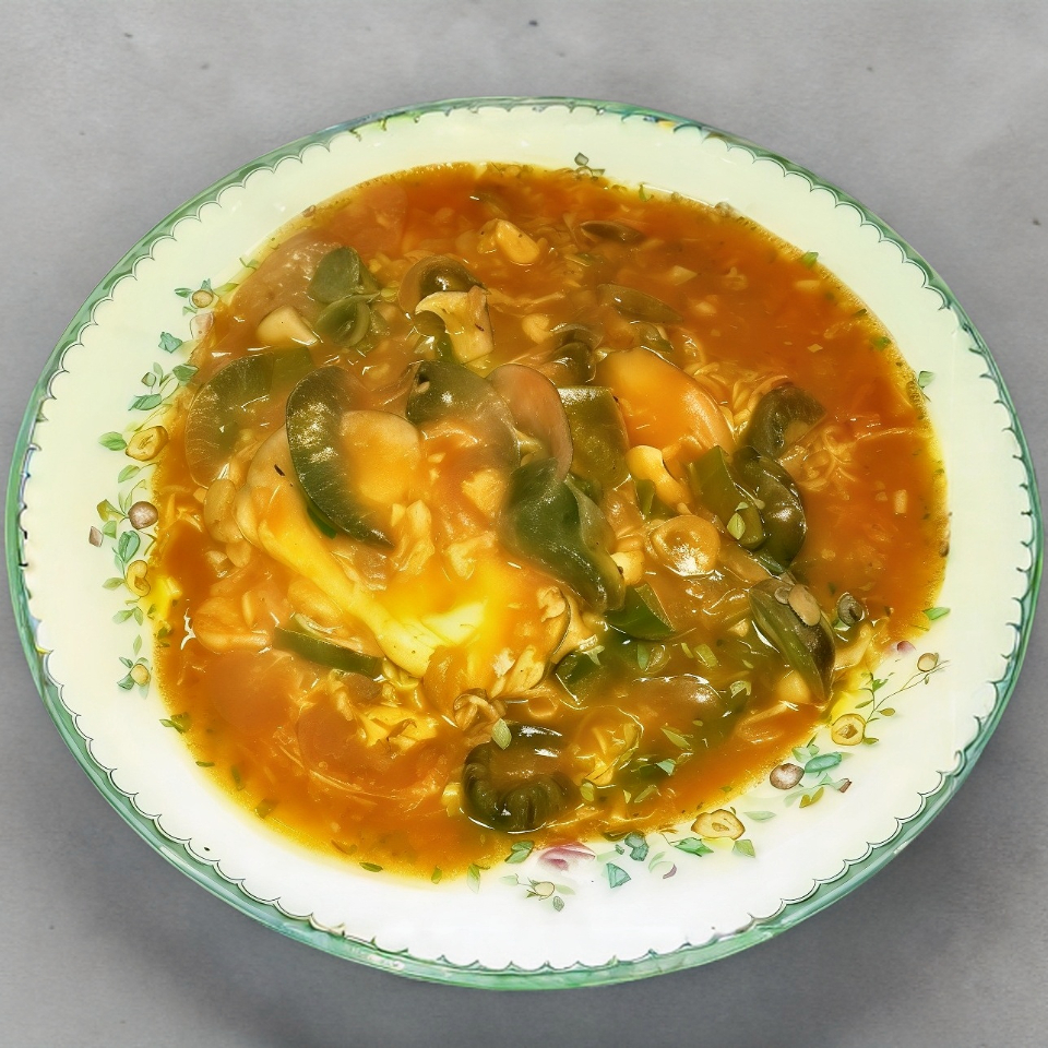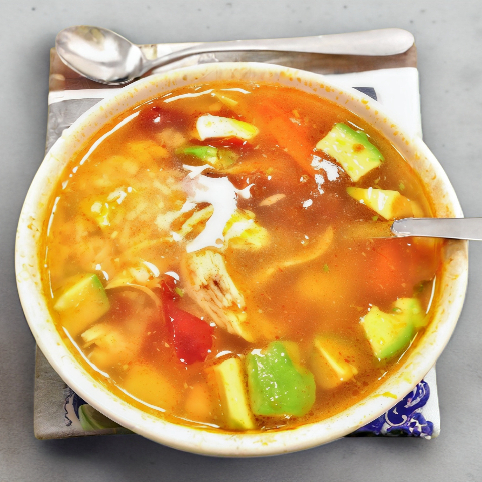 Salsa roja de la casa sazonada con epazote servido con pollo y verdura, acompañado de tortillas de maiz.
