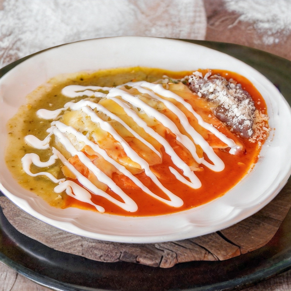 Servidos sobre tortilla refrita y bañados en salsa verde y roja, acompañados de frijoles refritos.