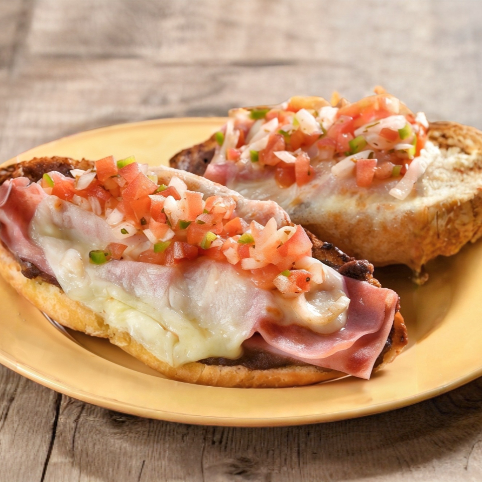 2 Piezas, coronados con tocino, chorizo, jamón y acompañados de pico de gallo.