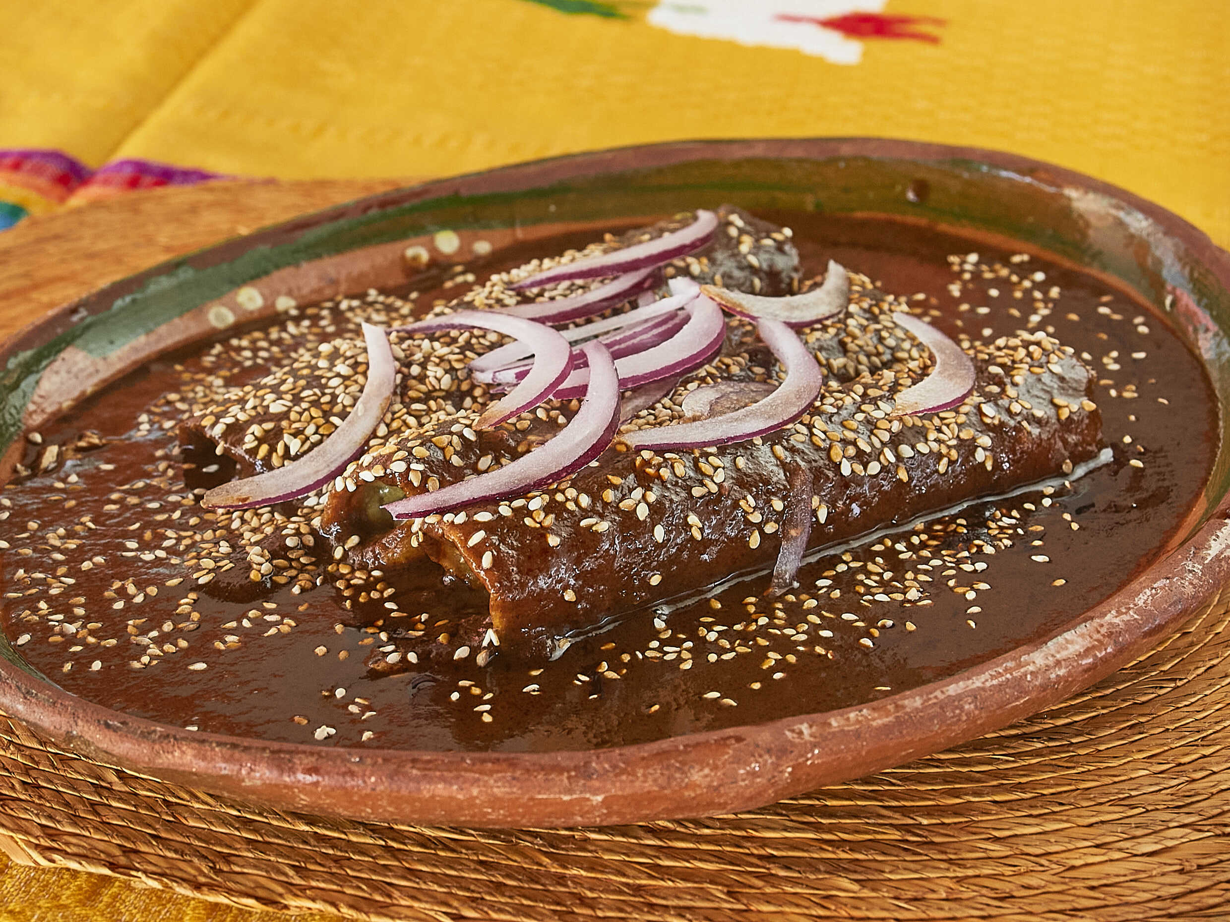 Rico arroz y mole de la casa, acompañado de tortillas.