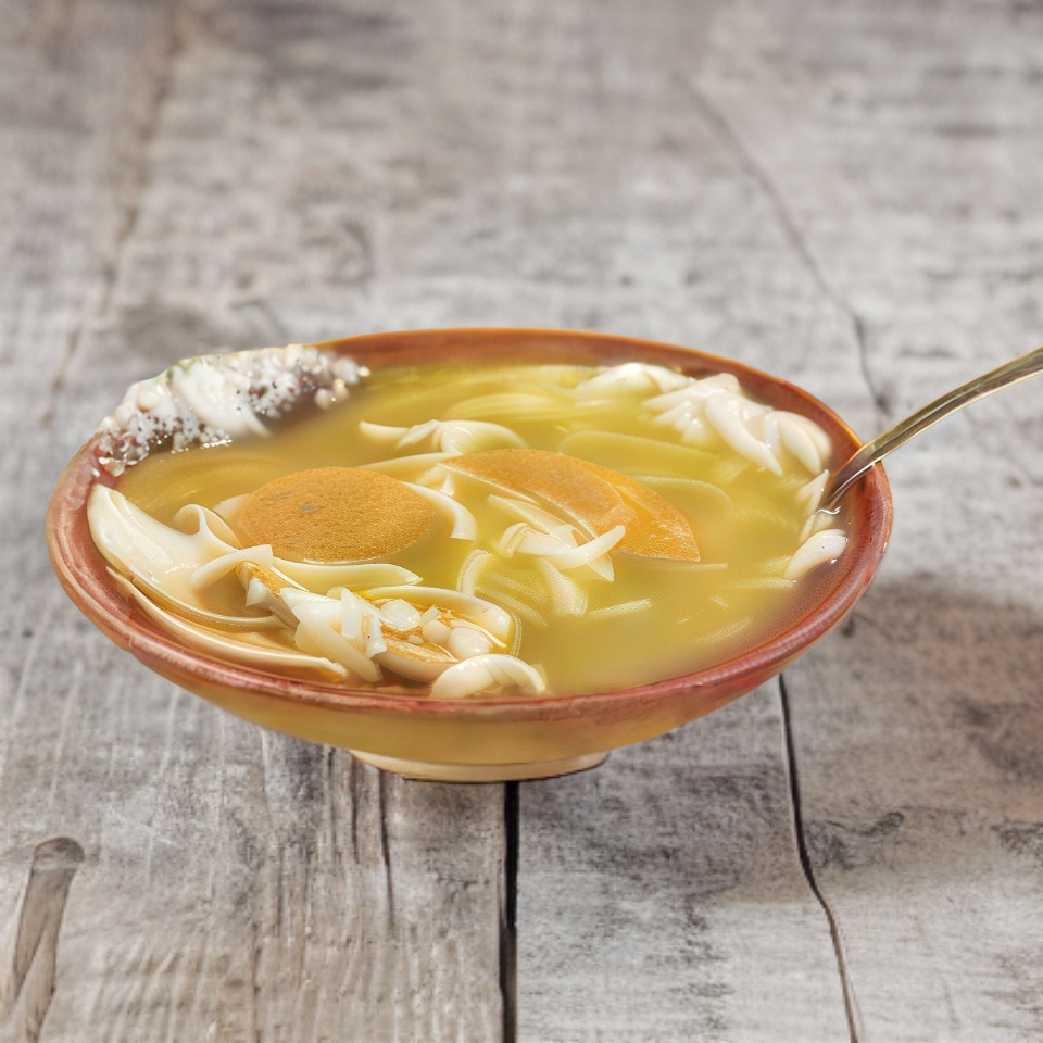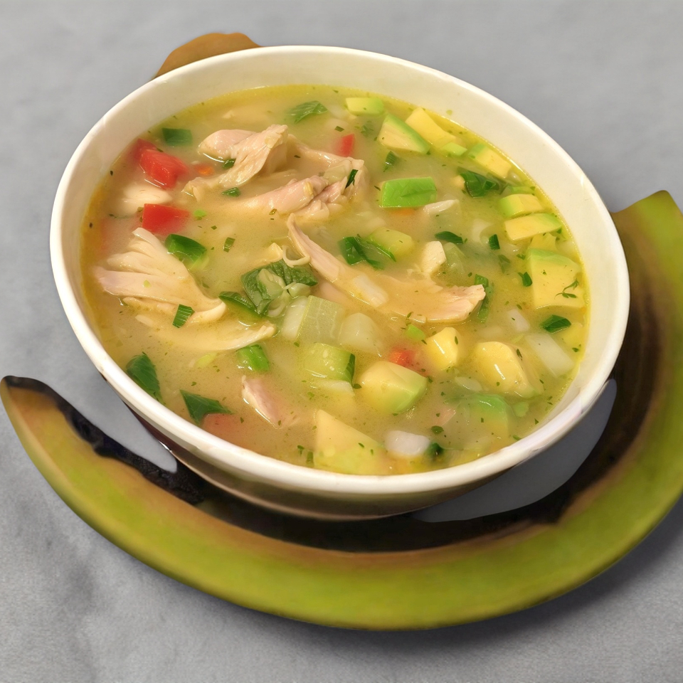 Fondo de pollo con pechuga deshebrada, arroz, cebolla, chilitos picados y limón para complementar.