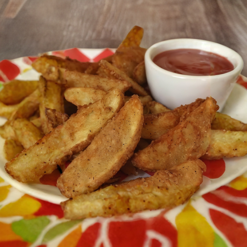 Crujiente por fuera con pechuga deshebrada por dentro acompañado de papas a la francesa.