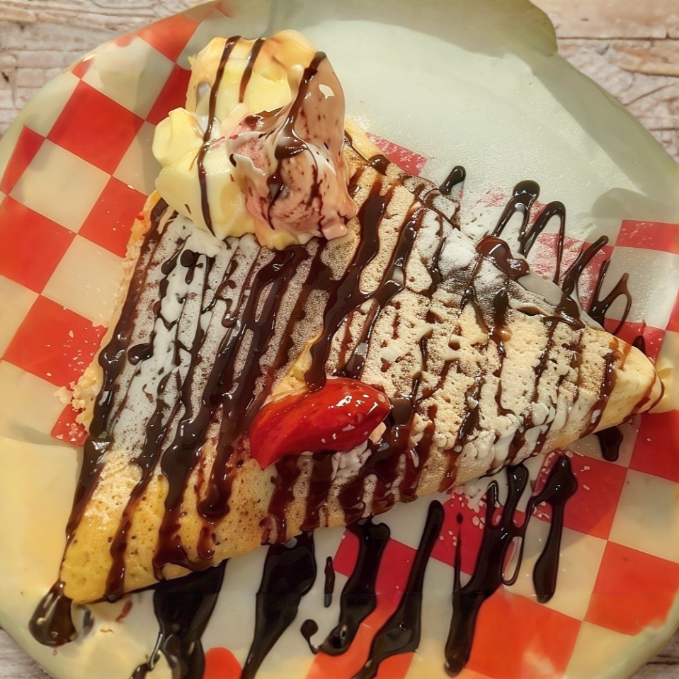 Nutella, cajeta, mermelada de fresa. Acompañadas de helado.