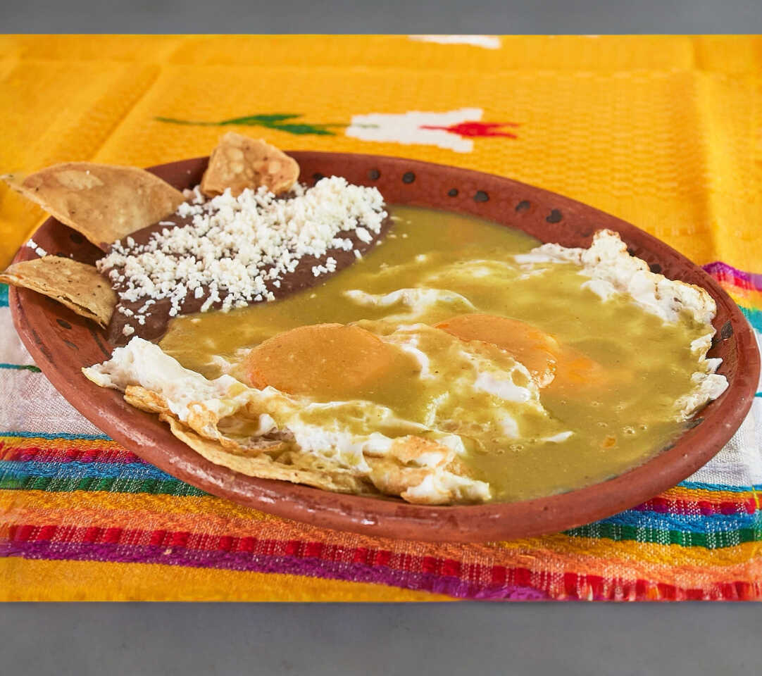 Servidos sobre tortilla refrita y bañados en salsa verde o roja, acompañados de frijoles refritos.