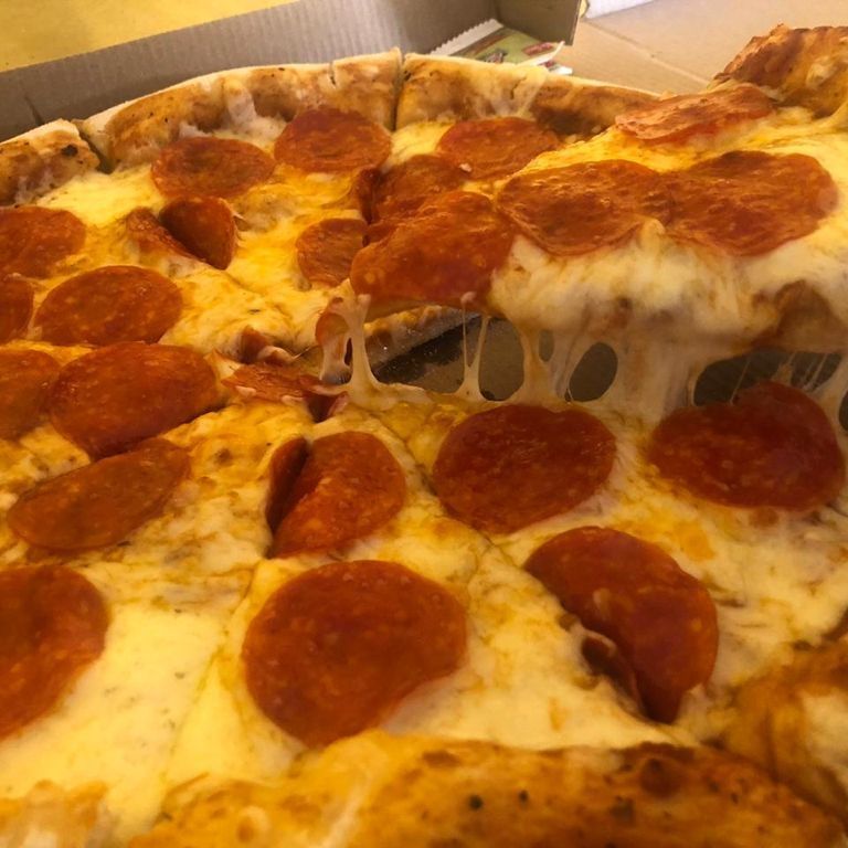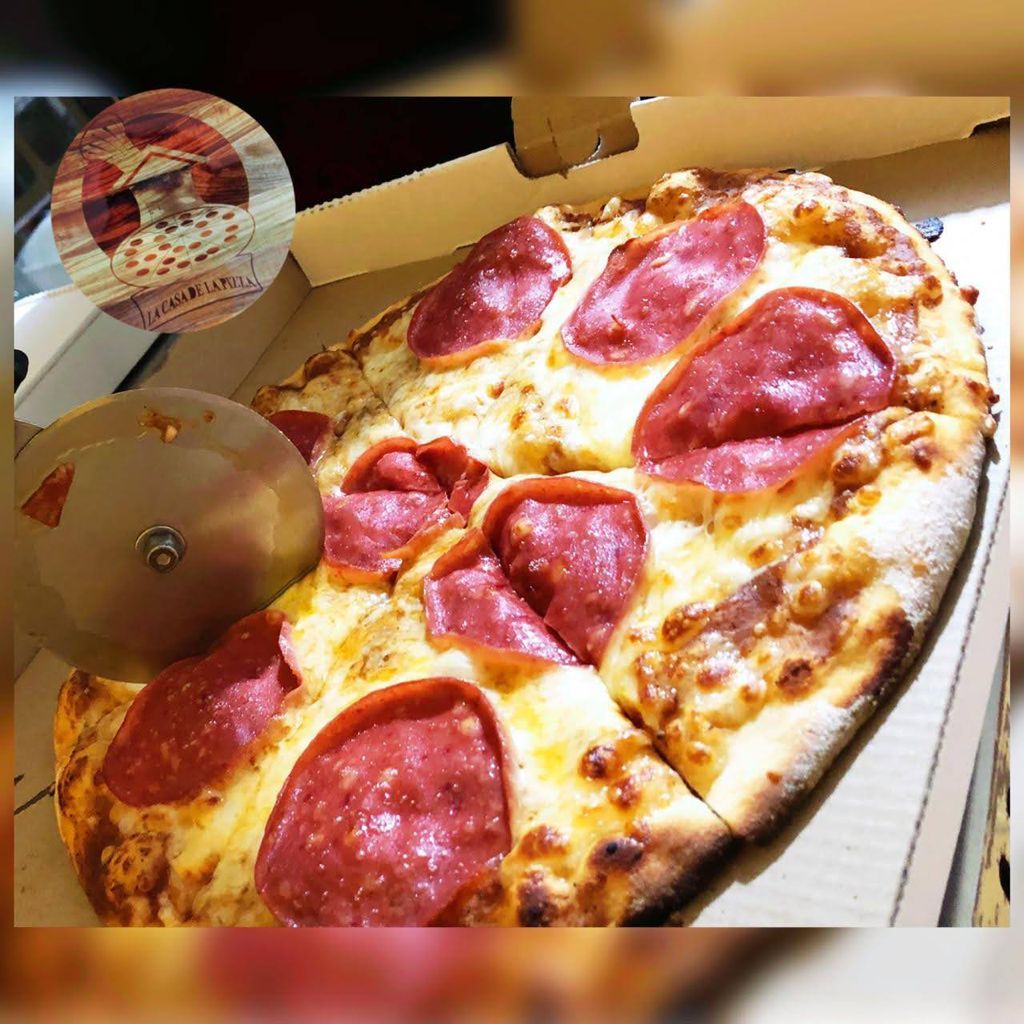 Salsa, queso mozzarella y pepperoni. Pizza grande de 35 centímetros.