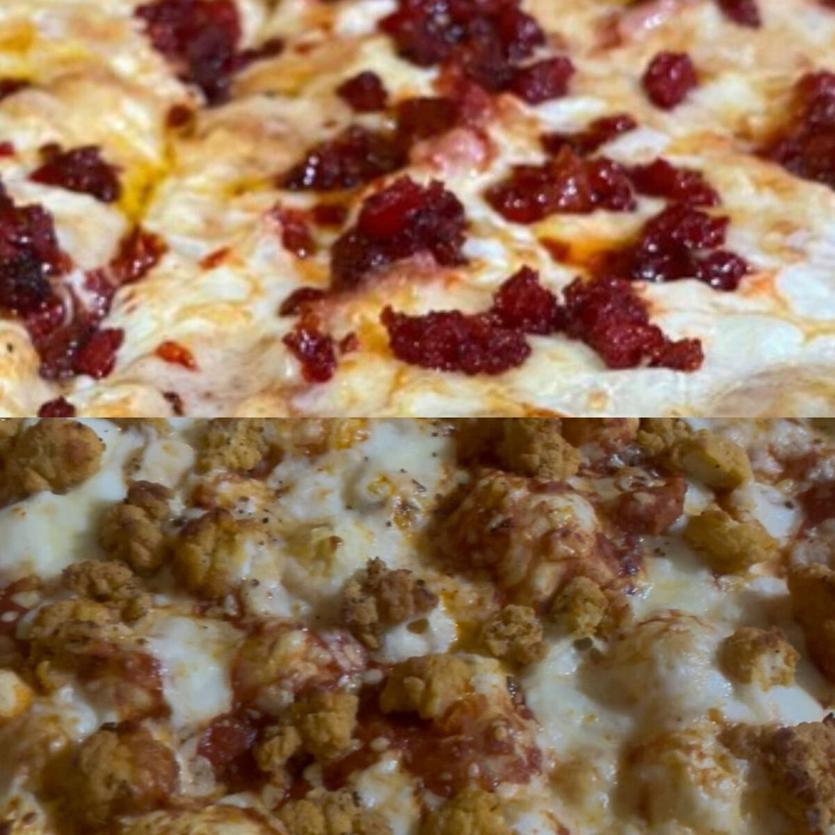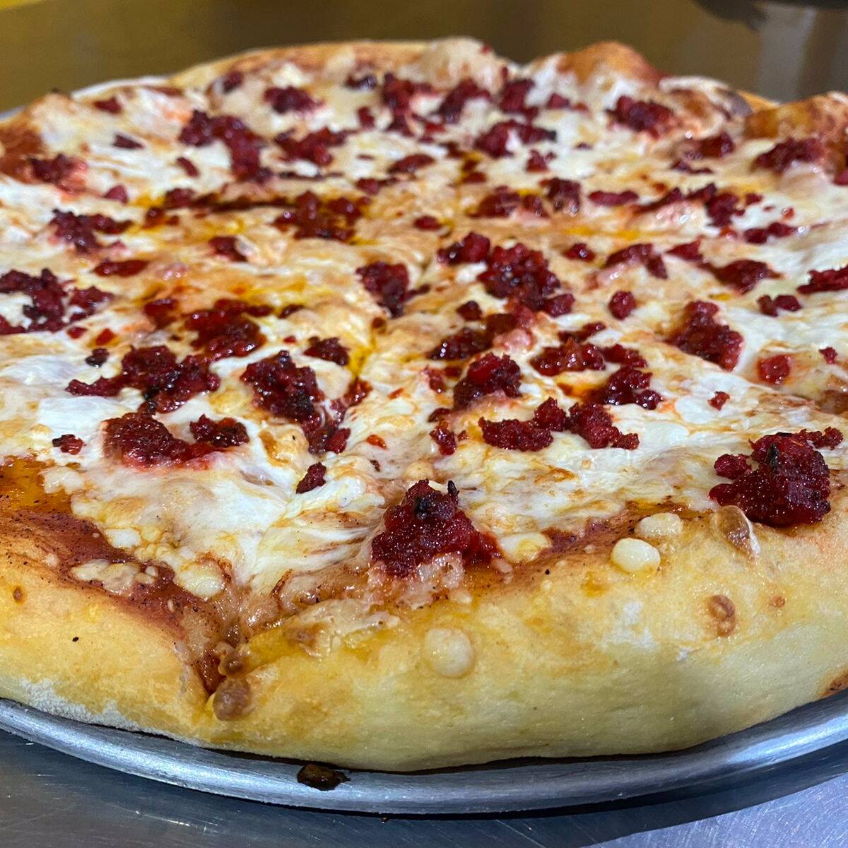 Salsa, queso mozzarella, longaniza, cebolla morada, jalapeños y frijoles. Pizza Grande de 35 centímetros.